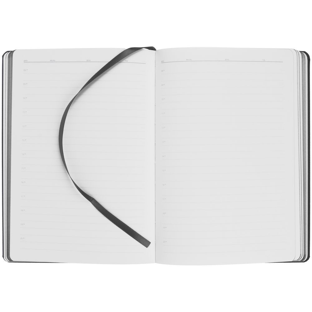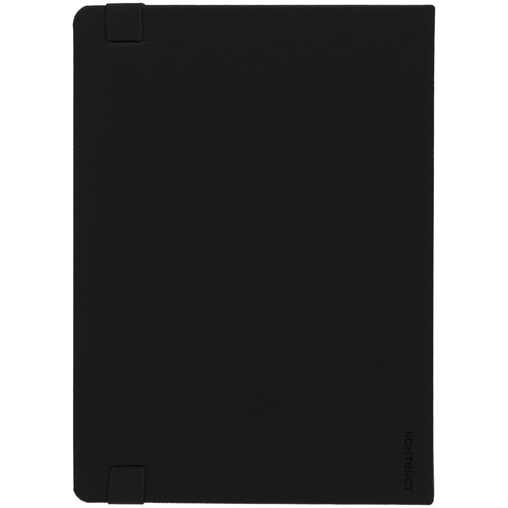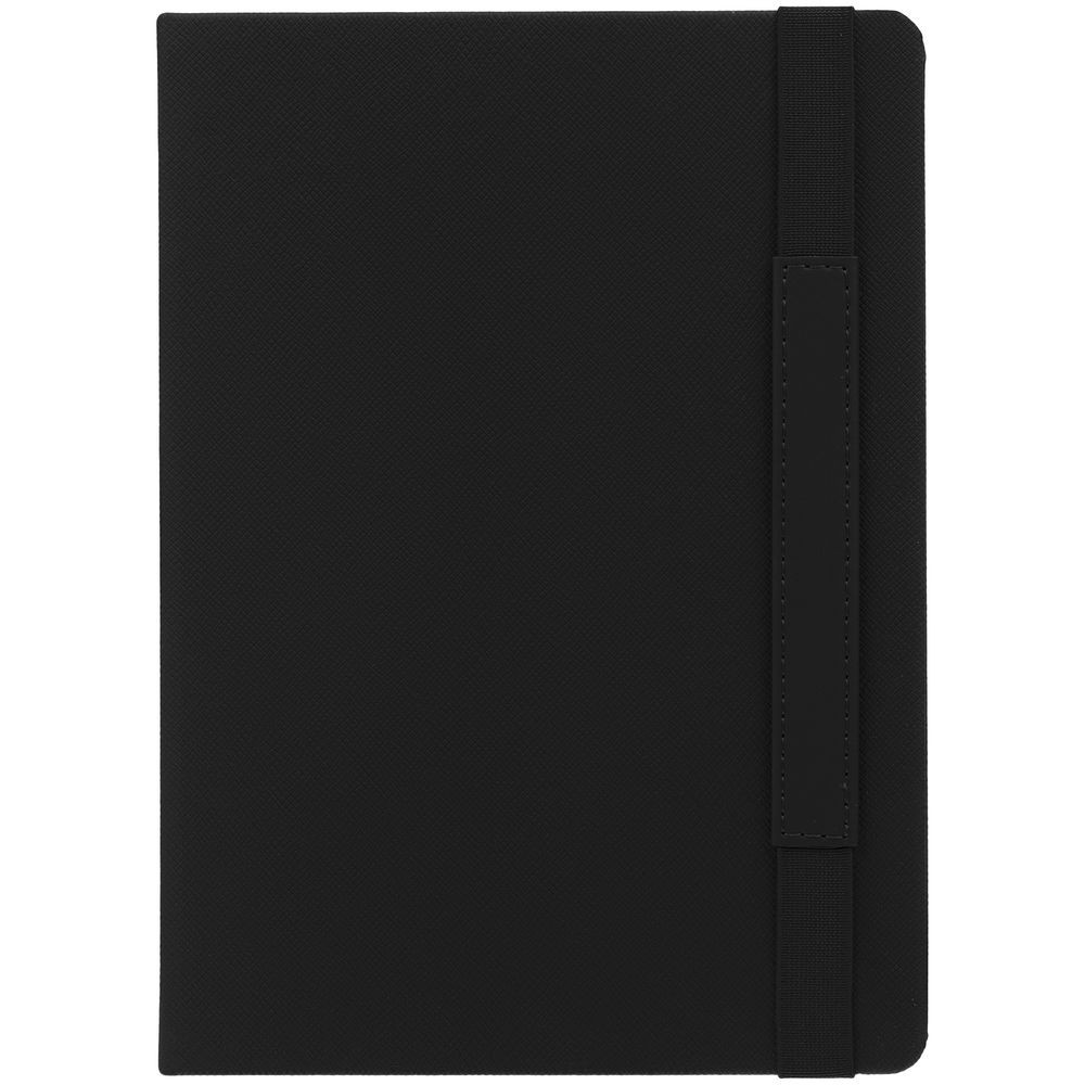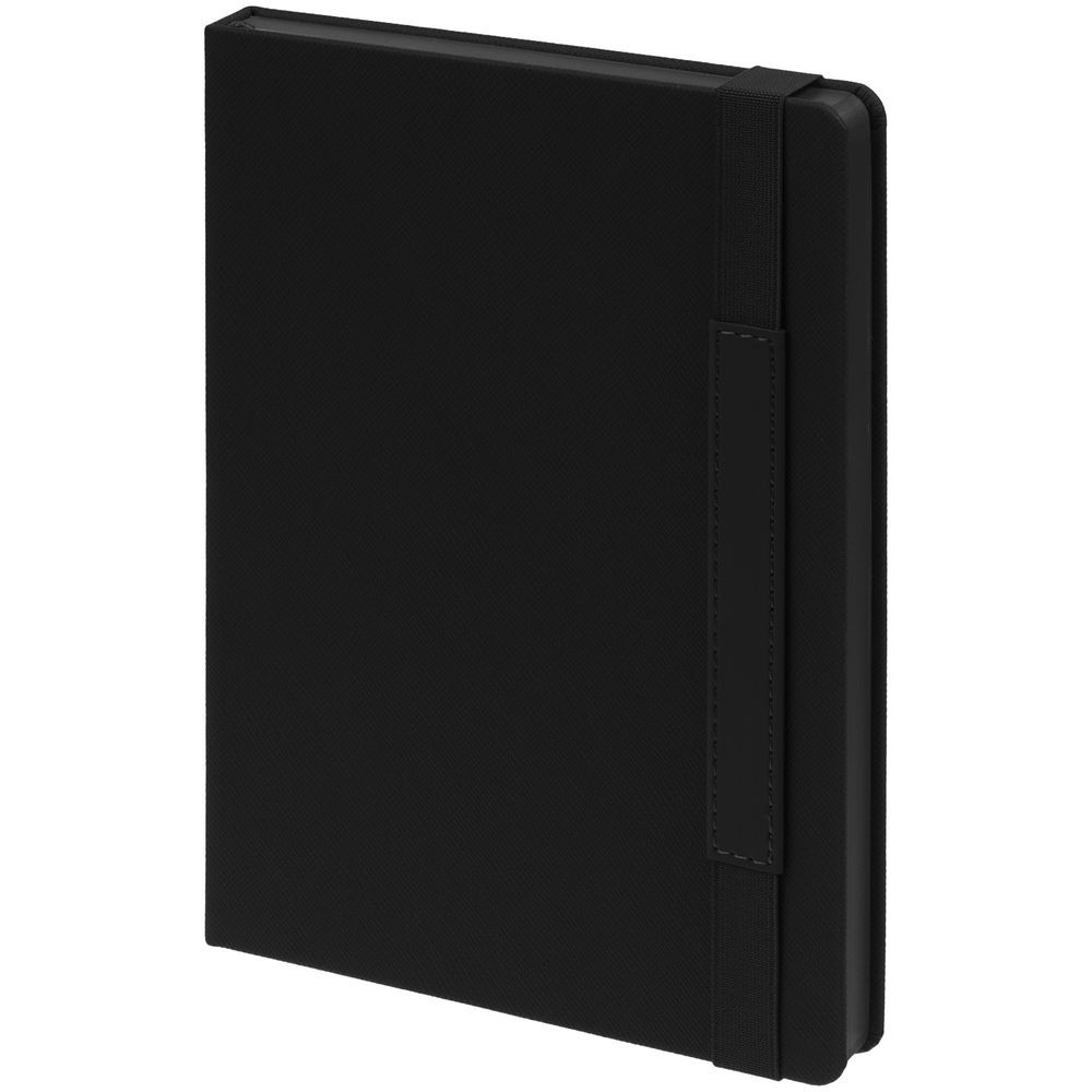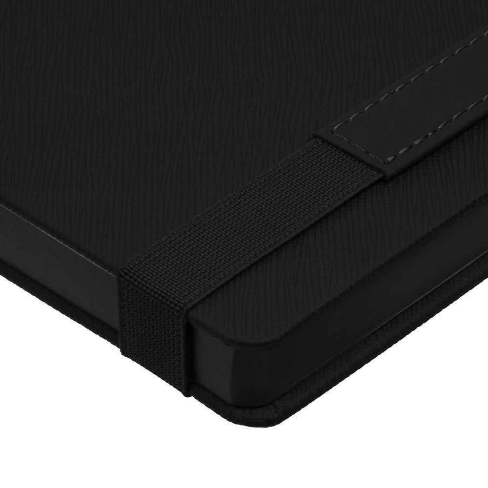 Ежедневник с твердой обложкой, выполнен из материала Nice Touch, черный АА, дополнен резинкой с лейблом из материала Soft Touch и ляссе в цвет обложки.