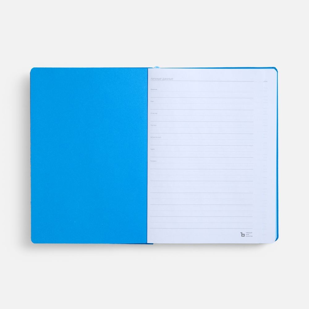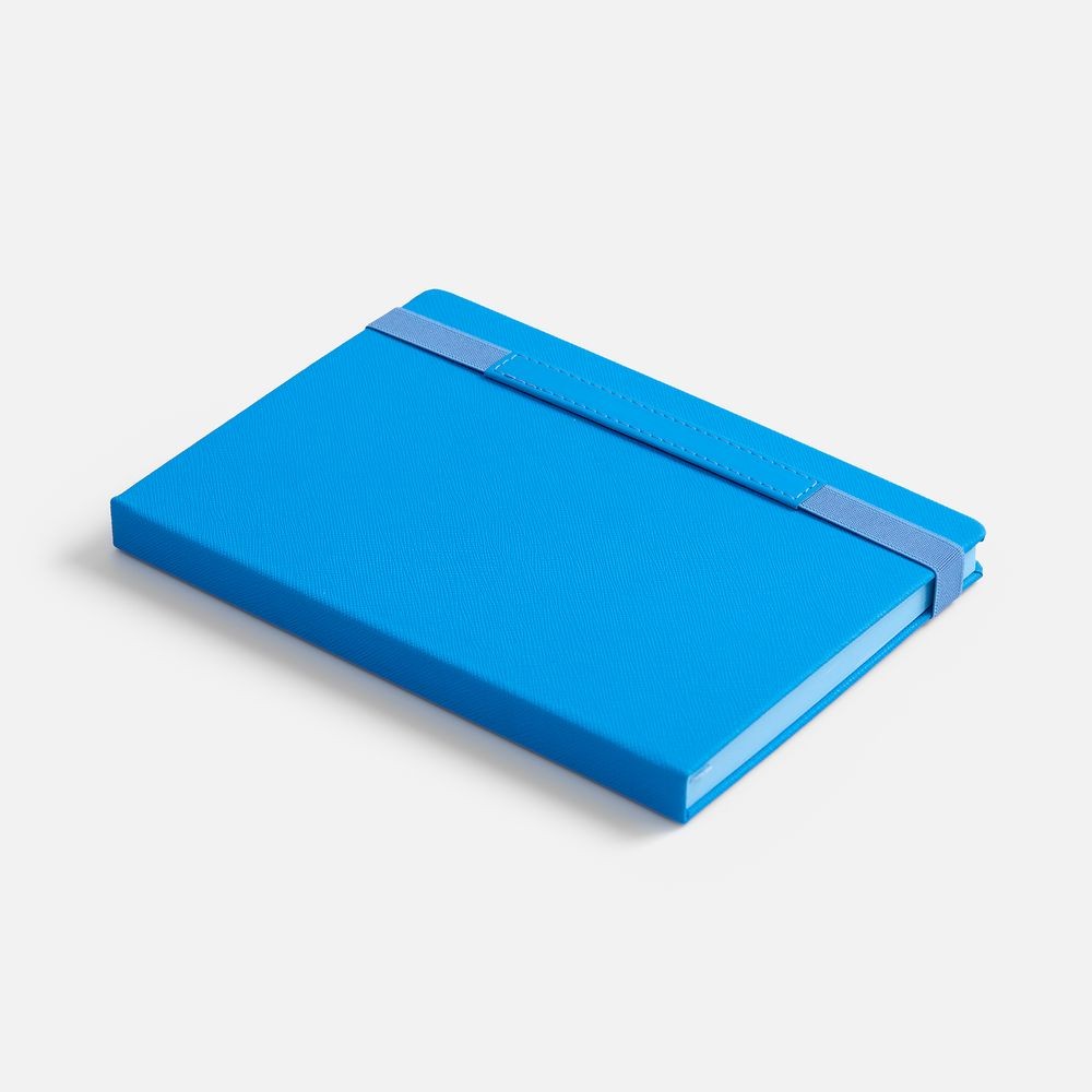 Ежедневник с твердой обложкой, выполнен из материала Nice Touch, голубой JJ, дополнен резинкой с шильдой из материала Soft Touch Ultra и ляссе в цвет обложки.