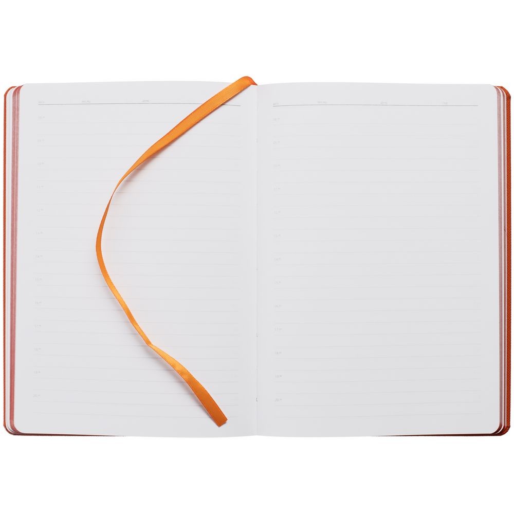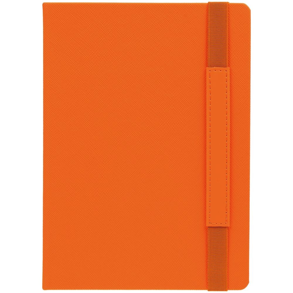 Ежедневник с твердой обложкой, выполнен из материала Nice Touch, оранжевый ОО, дополнен резинкой с лейблом из материала Soft Touch и ляссе в цвет обложки.