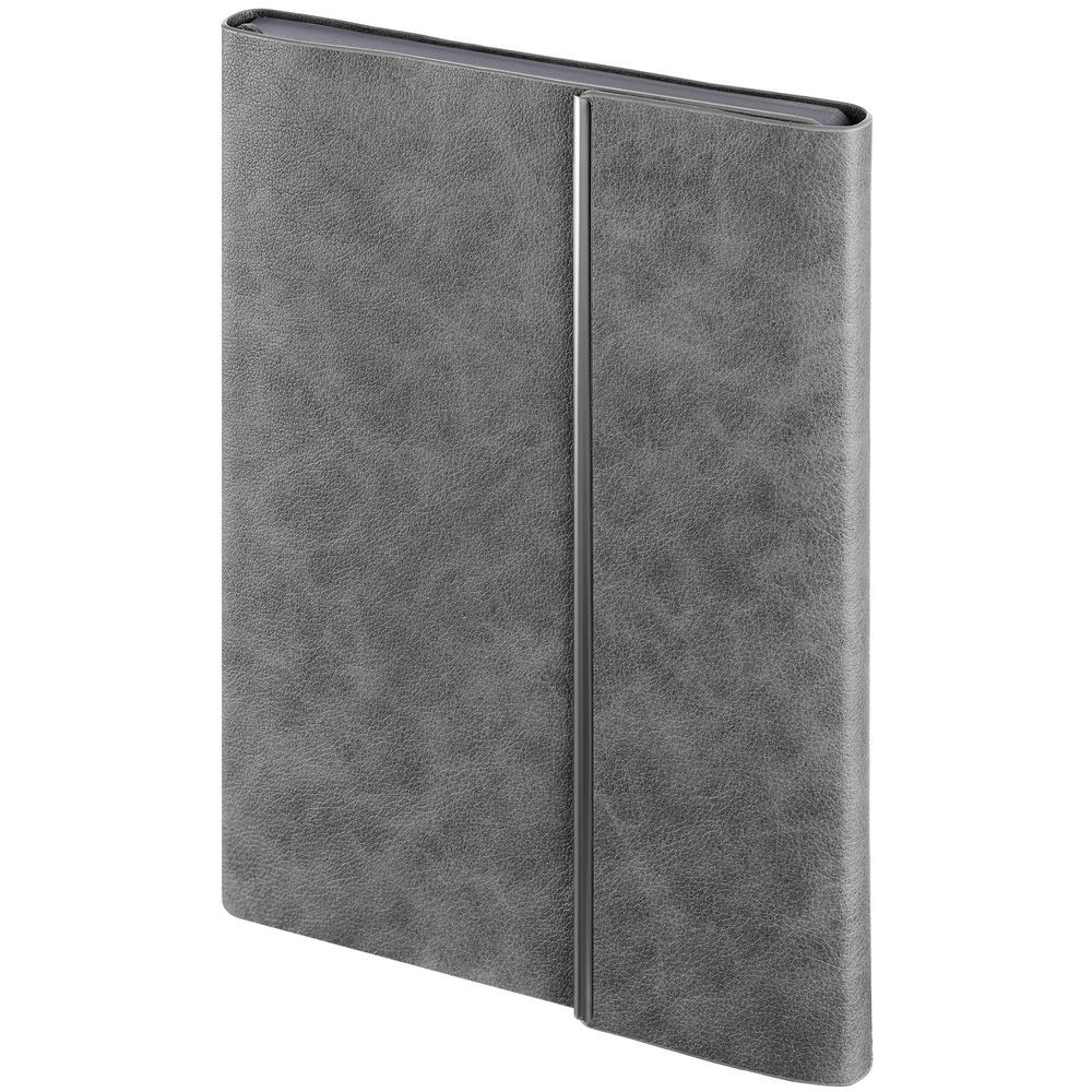 Ежедневник с гибкой обложкой, клапаном на магните и металлической отделкой клапана. Выполнен из материала Petrus, серый СС, дополнен серым ляссе.