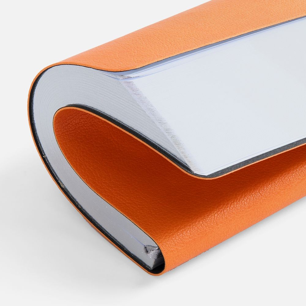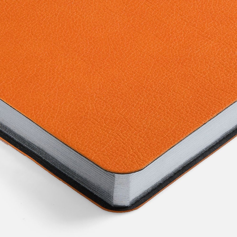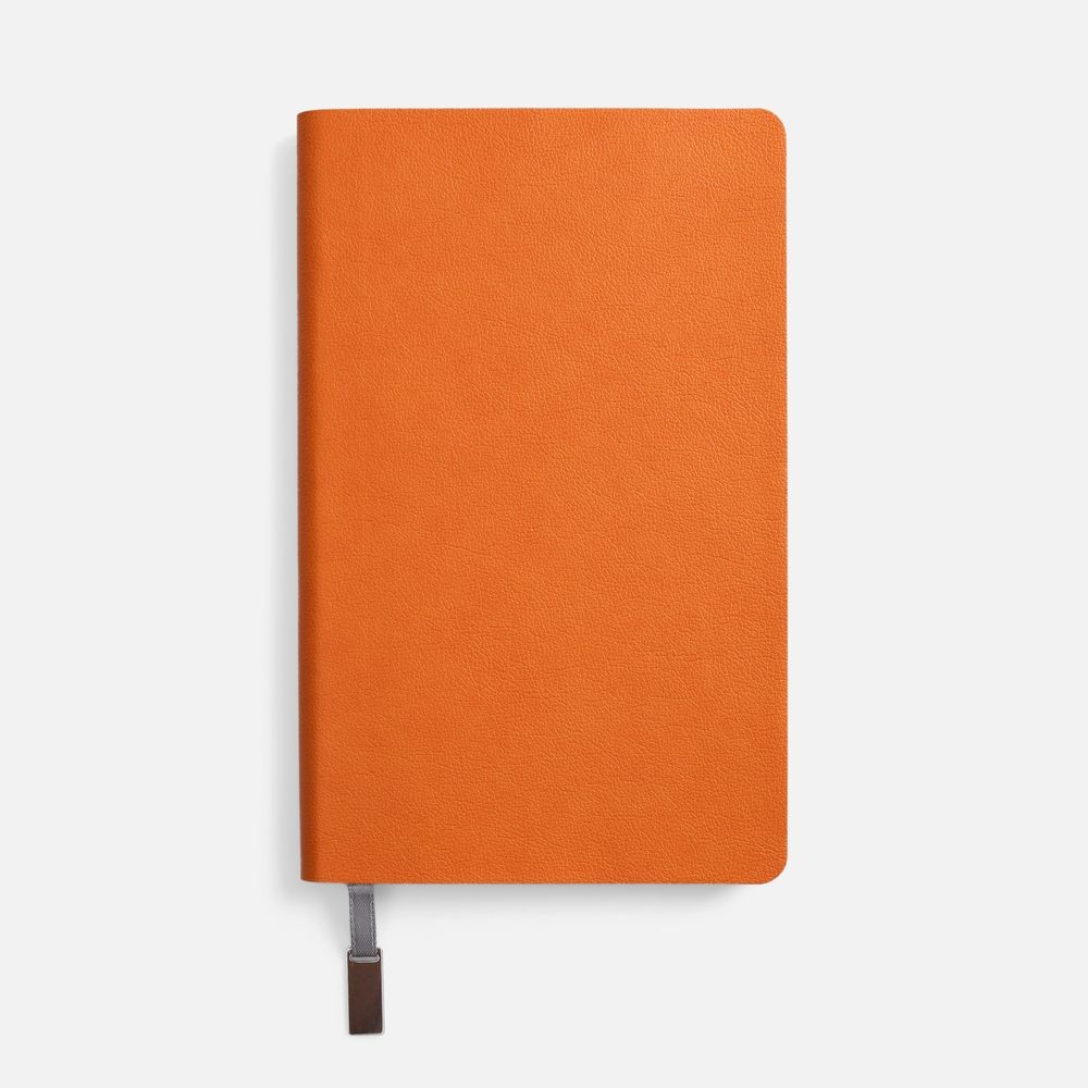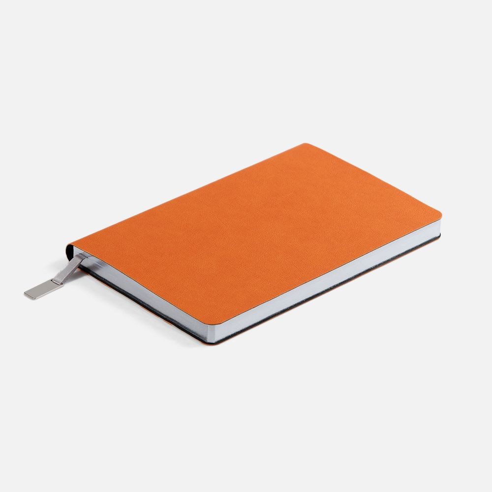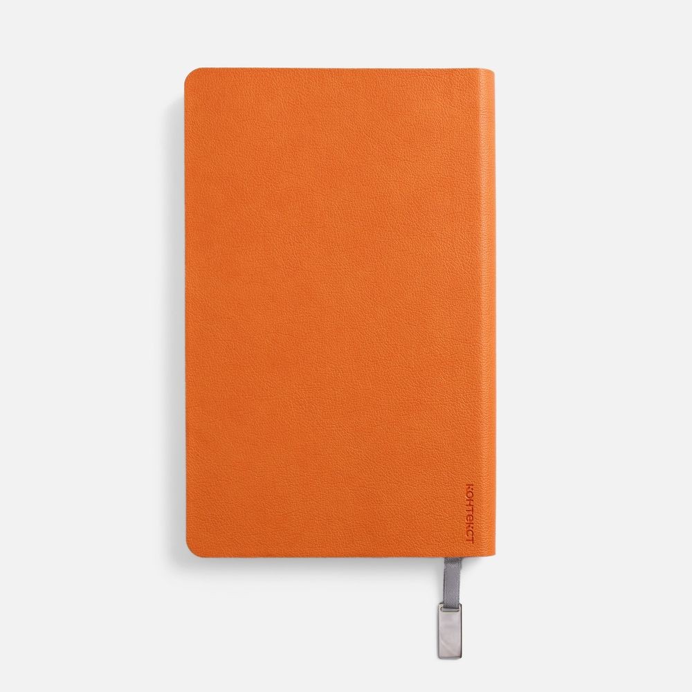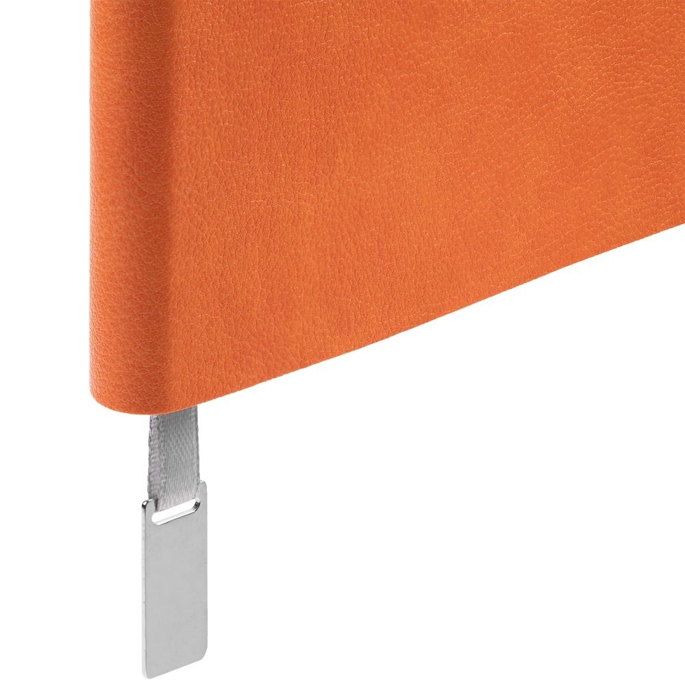 Ежедневник с гибкой обложкой, выполнен из материала Petrus, оранжевый ОО, дополнен серым ляссе с металлическим шильдиком.