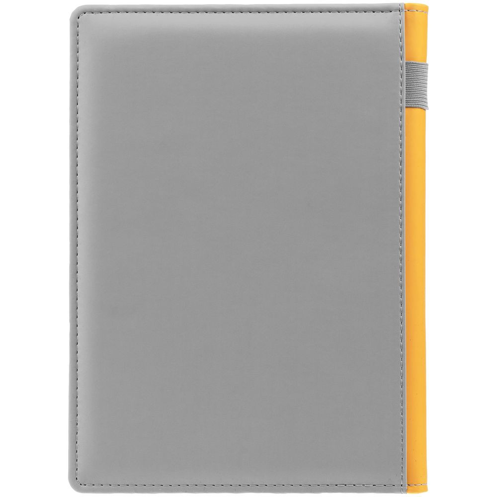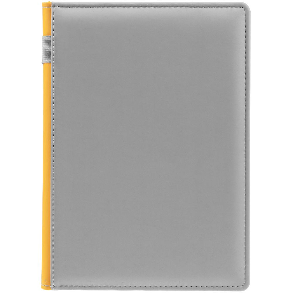 Твердая обложка с поролоном, материал обложки — Soft Touch, серый СС и Soft Touch, желтый КК. На корешке ежедневника находится петля из резинки.