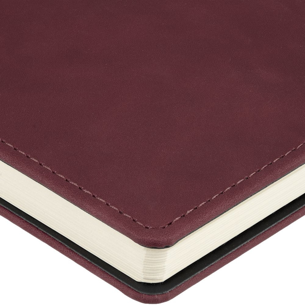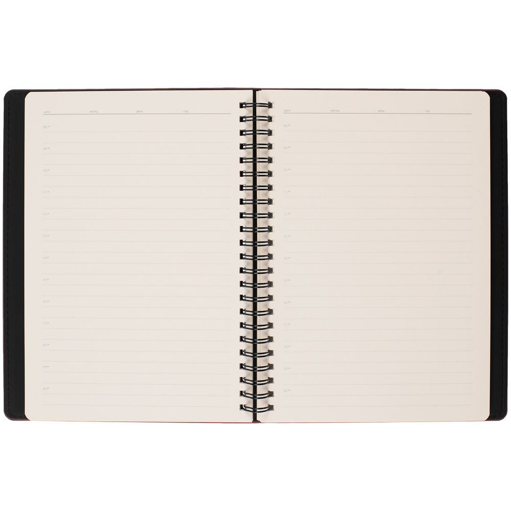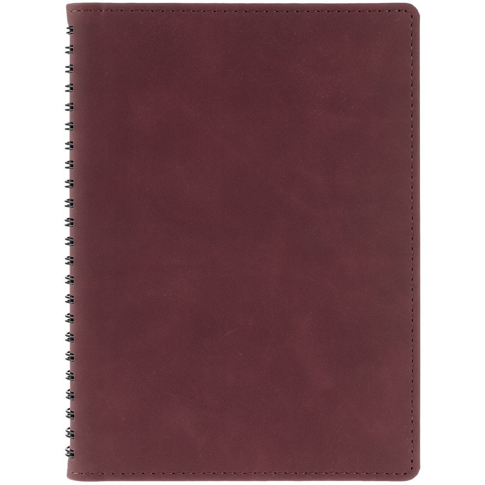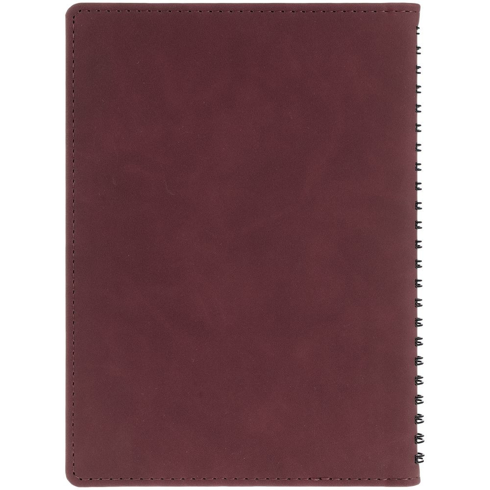 Ежедневник с блоком на пружине в твердой обложке, выполнен из материалов Nubuk Touch, винный SS и Soft Touch, черный AA.