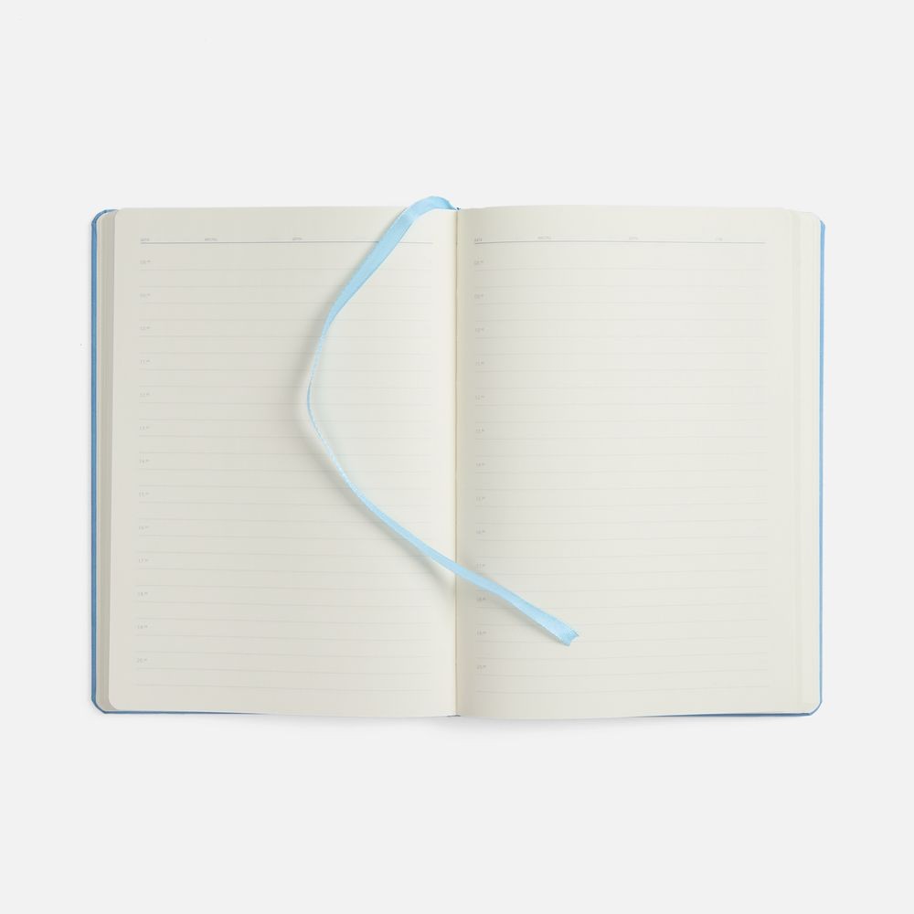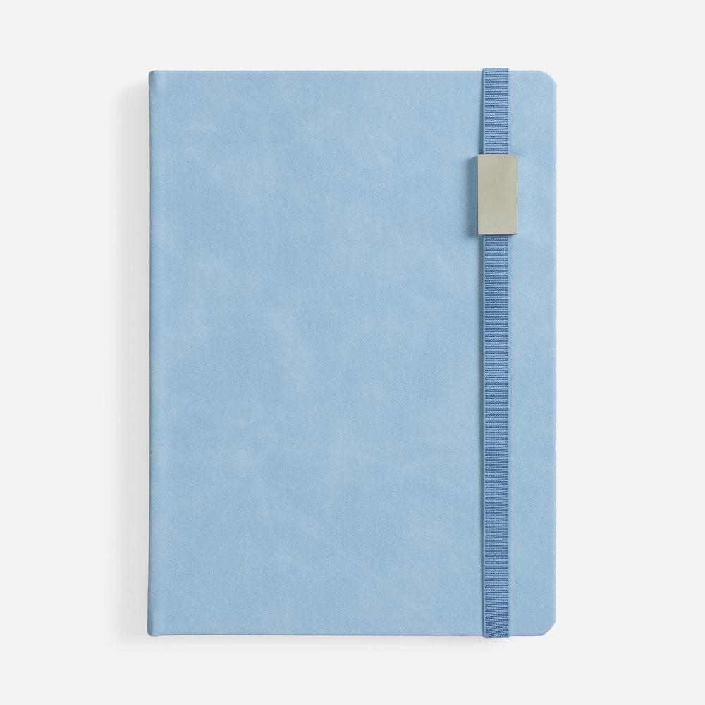 Ежедневник с твердой обложкой, выполнен из материала Nubuck Touch, голубой JJ, дополнен ляссе светло-голубого цвета.