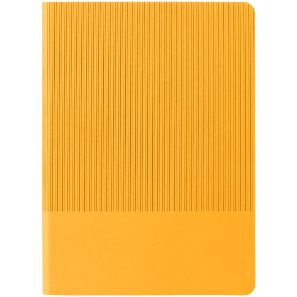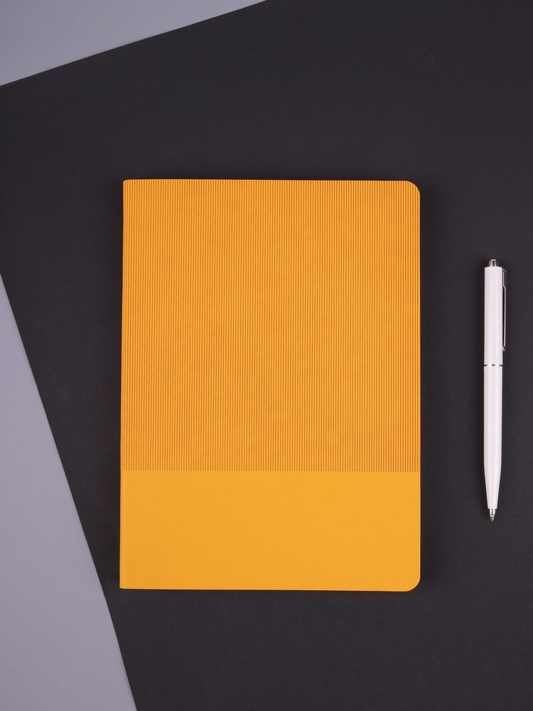 Ежедневник с гибкой обложкой выполнен из материала Soft Touch, желтый KK и Latte, желтый (внутренний материал); дополнен ляссе желтого цвета и фактурным тиснением обложки.