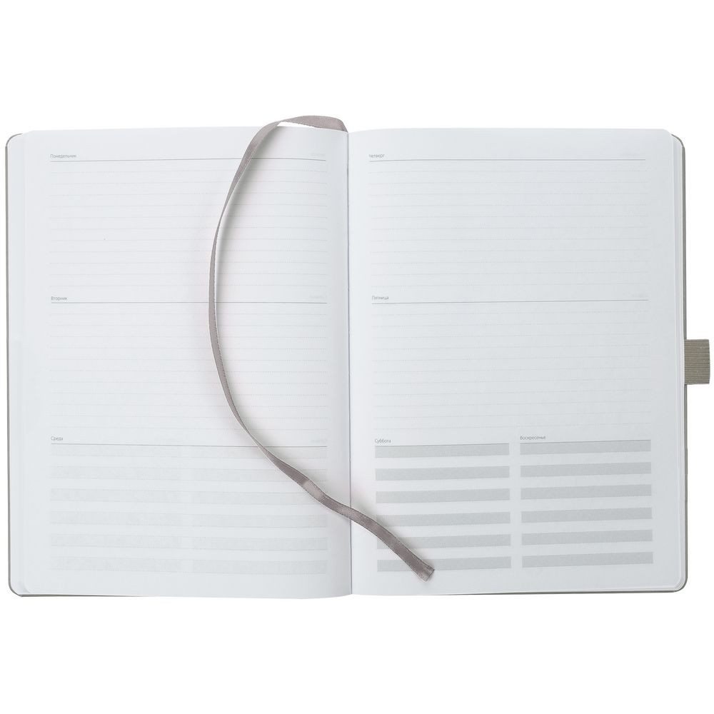 Еженедельник в твердой обложке выполнен из материала Vintage, серый СС, дополнен резинкой, петлей для ручки и ляссе серого цвета.