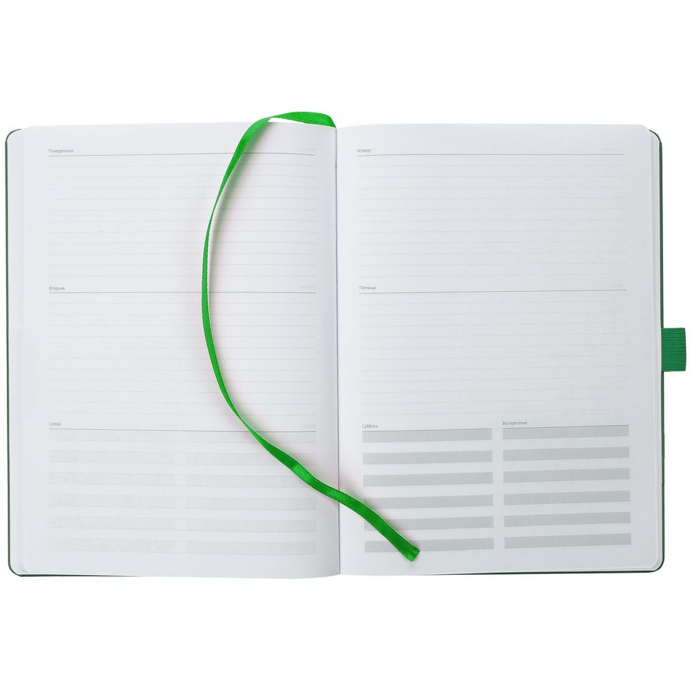 Еженедельник в твердой обложке выполнен из материала Nebraska, зеленый FF, дополнен резинкой, петлей для ручки и ляссе зеленого цвета.