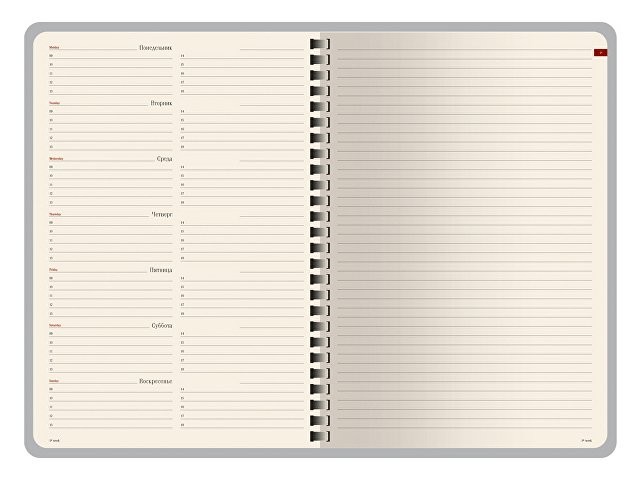 Деловые еженедельники Concept - это воплощение современного дизайна, в котором сочетаются практичные детали. Благодаря удобному формату slim-pocket еженедельник легко помещается в сумку. Еженедельник Concept в классической серой обложке формата А5. Практичный, привлекательный и приятный на ощупь материал обложки на протяжении всего срока службы сохраняет презентабельный вид. Уголки обложки имеют закругленную форму, по всему периметру сделана прострочка нитками в тон. Недатированный блок состоит из 128 страниц, укреплённых на пластиковом полускрытом гребне. На 21 странице размещена справочная информация на русском языке. День недели указан на русском и английском языках. Блок является сменным и вставляется внутрь обложки. С внутренней стороны обложка имеет вырубные отделения для визиток и кредитных карт, а также петлю для ручки на резинке. Для хранения чеков, записок и бумаг внутри расположен прозрачный пластиковый конверт.