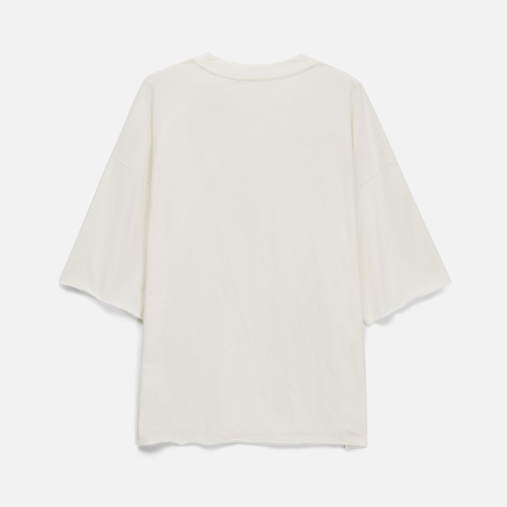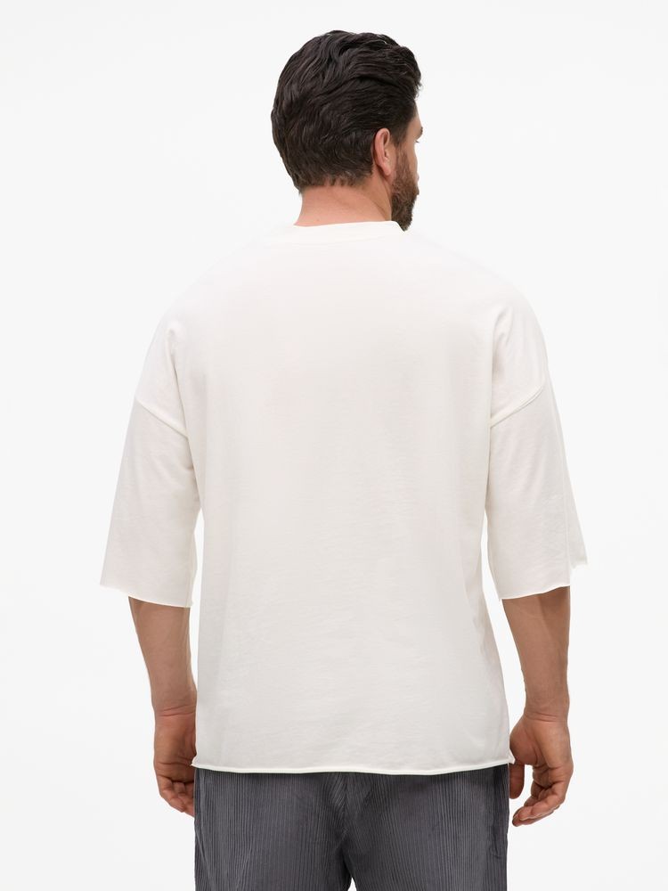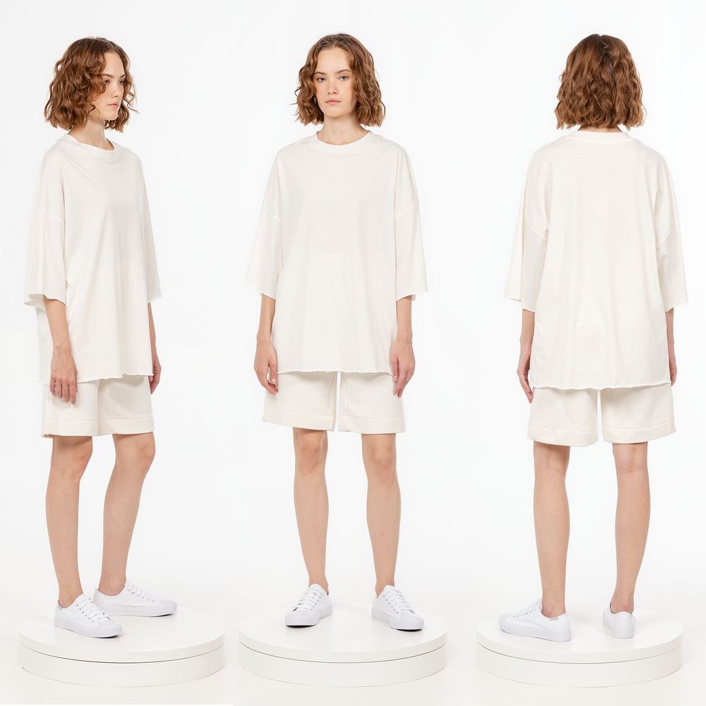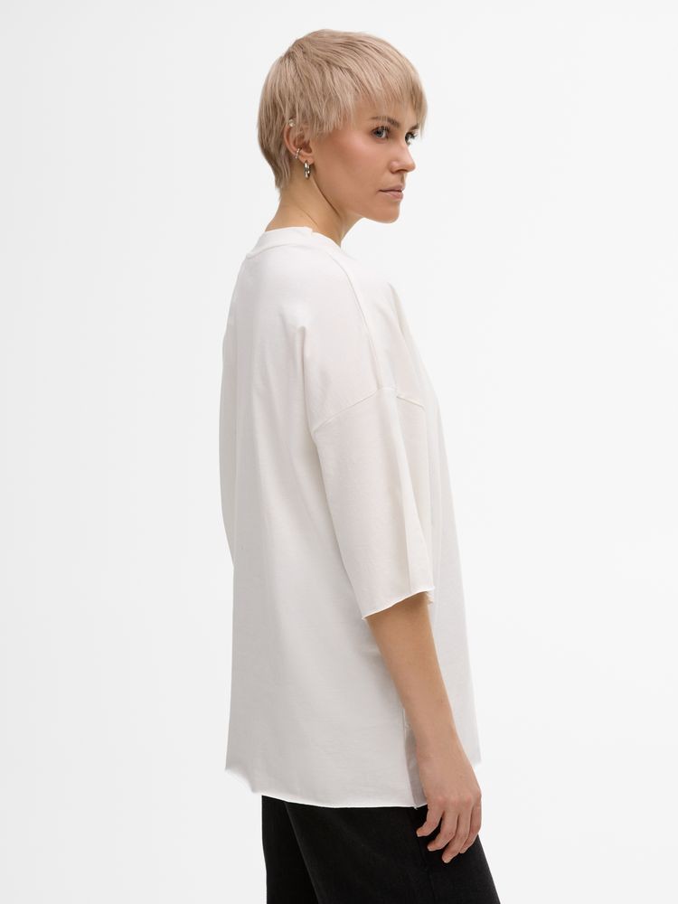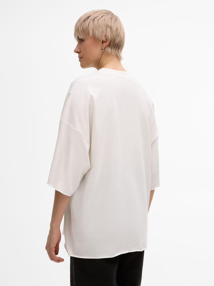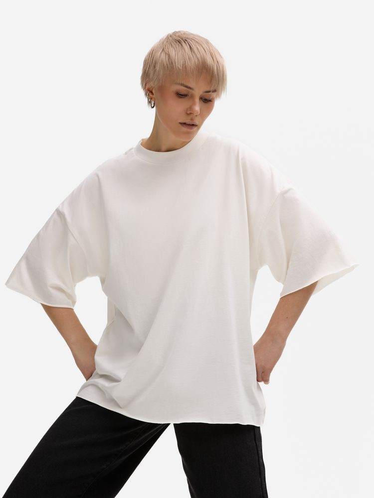 Футболка унисекс свободного кроя со спущенным плечом.