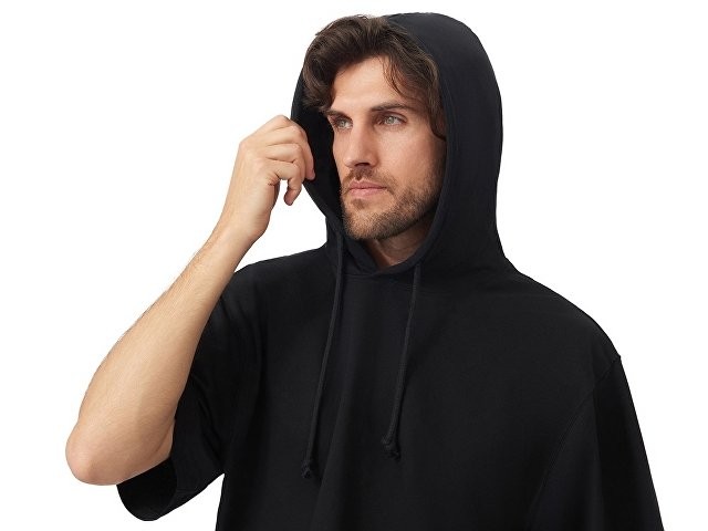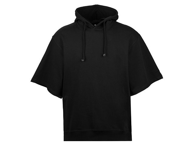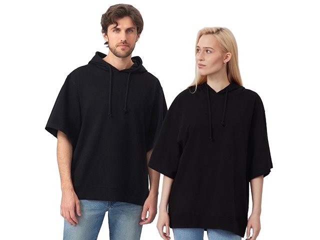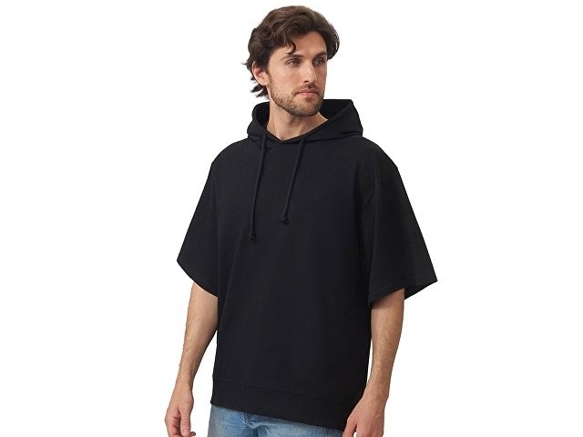 Худи с коротким рукавом выполнено из хлопкового френч терри с петельками на изнаночной стороне. Подкладка капюшона выполнена из основного полотна для объемной посадки. Модель комфортной и актуальной посадки оверсайз отлично подходит для обычной жизни и в качестве промо мерча. - оверсайз посадка - низ обработан рибом 2х2 и дополнительно отстрочен для укрепления - мягкое и качественное полотно френч терри - увеличенная зона для нанесения из-за отсутствия кармана