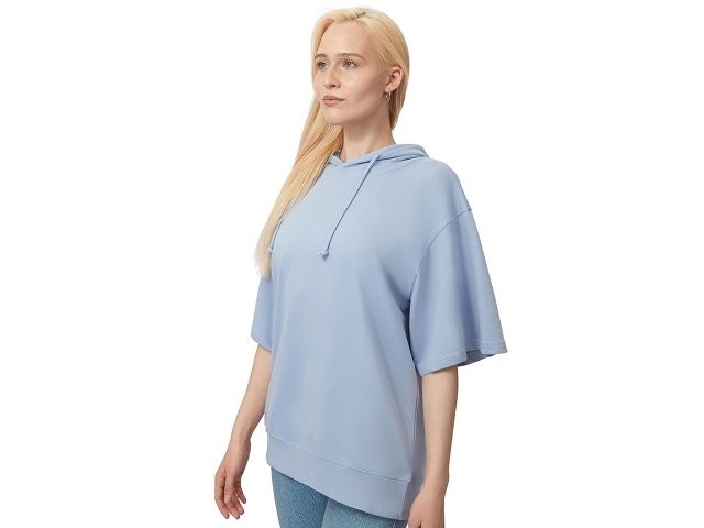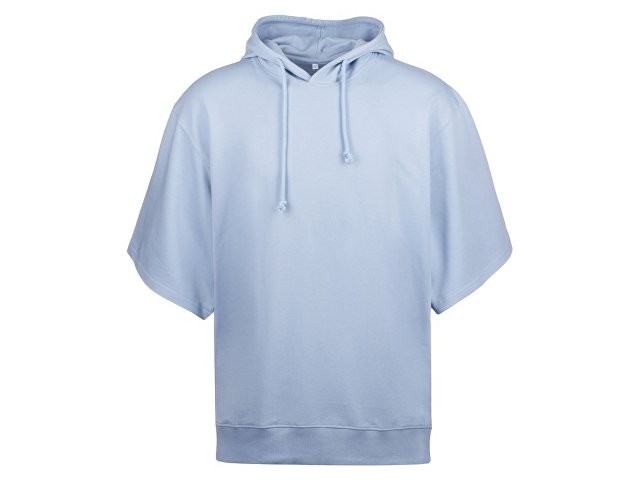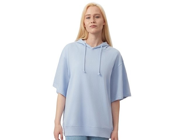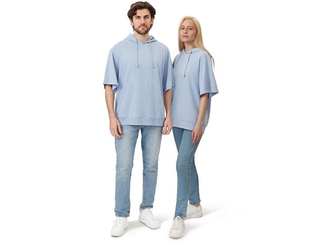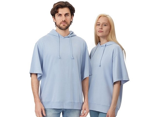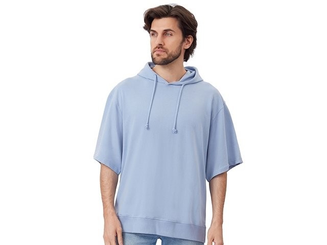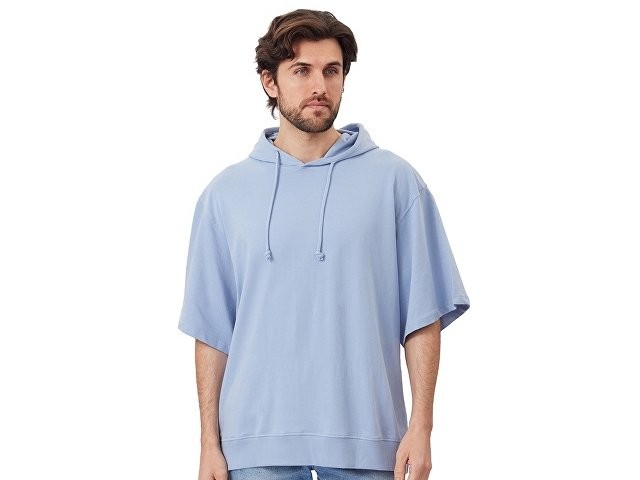 Худи с коротким рукавом выполнено из хлопкового френч терри с петельками на изнаночной стороне. Подкладка капюшона выполнена из основного полотна для объемной посадки. Модель комфортной и актуальной посадки оверсайз отлично подходит для обычной жизни и в качестве промо мерча. - оверсайз посадка - низ обработан рибом 2х2 и дополнительно отстрочен для укрепления - мягкое и качественное полотно френч терри - увеличенная зона для нанесения из-за отсутствия кармана