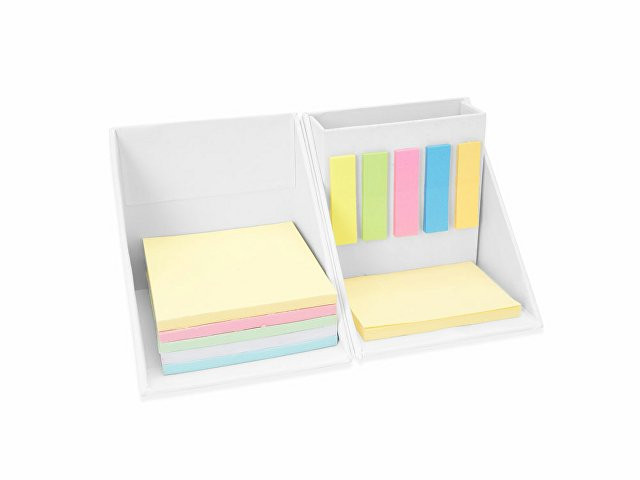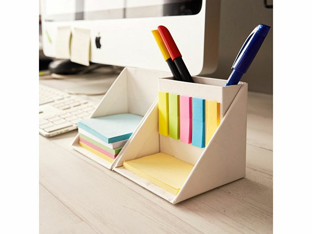 Картонный настольный набор в форме куба, состоящий из подставки для карандашей, блокнота (250 листов) и 180 самоклеящихся стикеров разных цветов.
