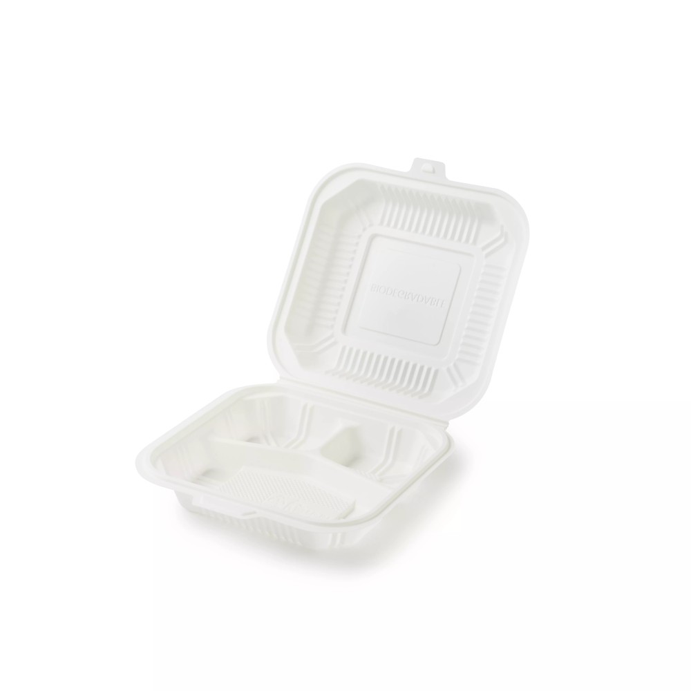 Когда вы отправляетесь на пикник или собираетесь в дальнюю автомобильную поездку, незаменимым атрибутом становятся одноразовые столовые приборы, стаканчики, тарелки и контейнеры. После использования, их можно утилизировать собственными силами без вреда для окружающей среды. Кукурузный крахмал – основное составляющее посуды. Он имеет все необходимые свойства, а также абсолютно безопасен для здоровья человека. Его используют и в пищевой, и в медицинской, и в текстильной промышленностях. Стойкость к разным температурным режимам – одно из важных свойств биоразлагаемой посуды. Такая посуда выдерживает как низкие, так и высокие температуры. Ее можно использовать в микроволновой печи и морозильной камере. Безопасность и отсутствие вредных соединений – основное преимущество посуды из крахмала. Биоразлагаемая посуда не содержит пагубных веществ, не засоряет окружающую среду. Экологичная упаковка для продуктов, которая не выделяет в пищу примесей и запахов даже при нагревании. Контейнер из кукурузного крахмала с разделением на три зоны с крышкой.