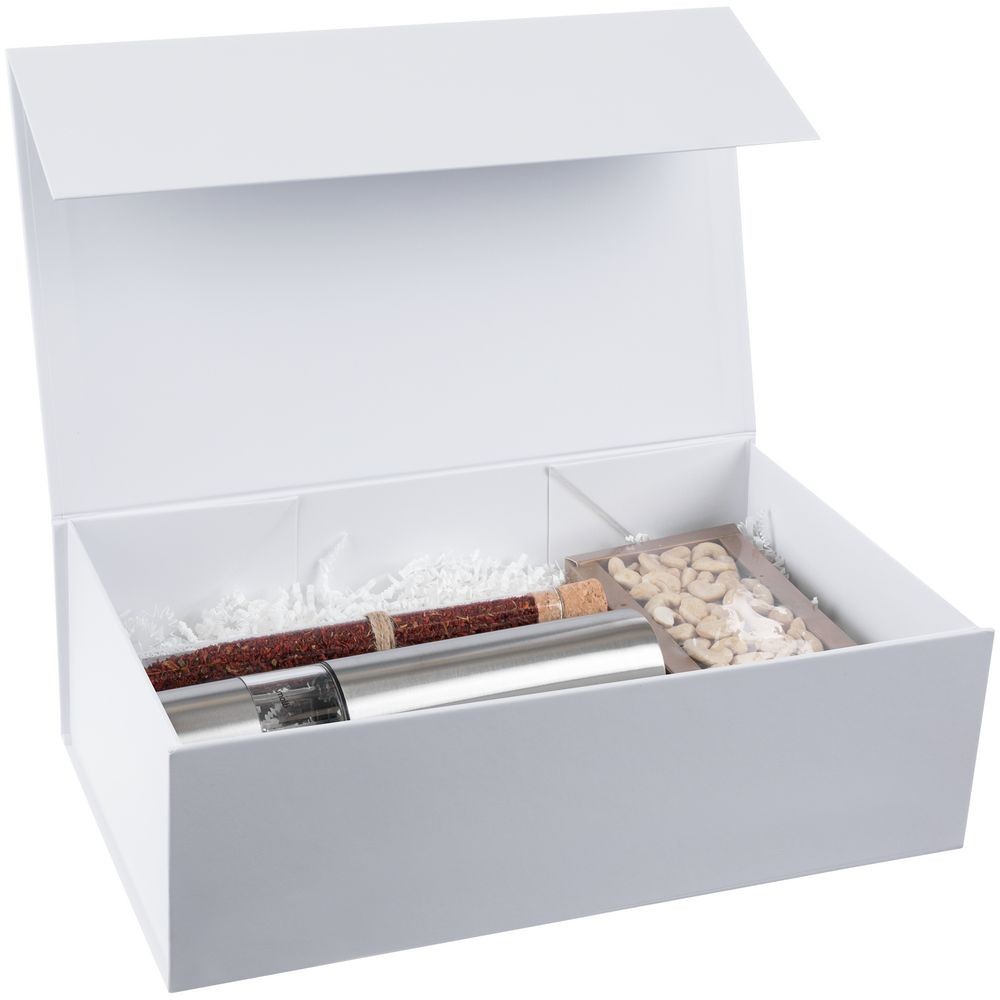 Коробка из переплетного картона, кашированного мелованной бумагой с матовой ламинацией. Крышка на магните.