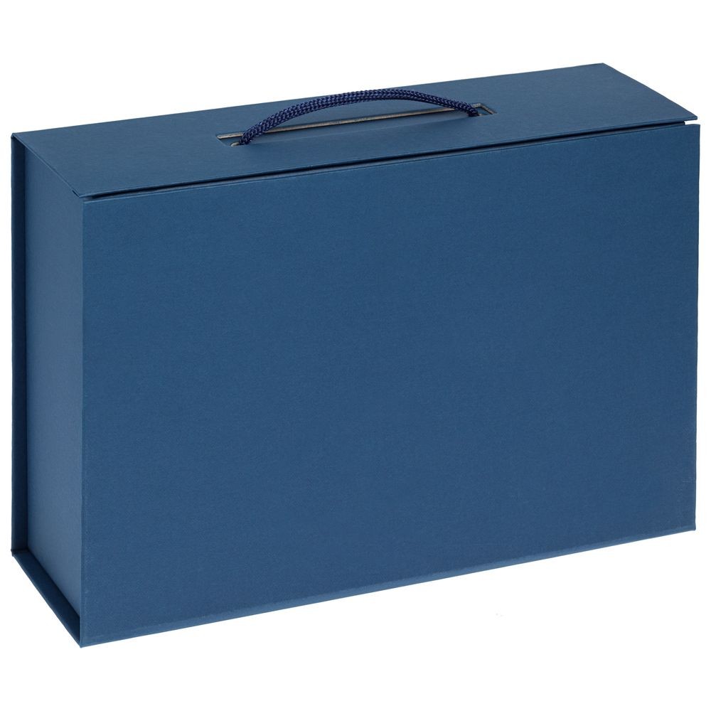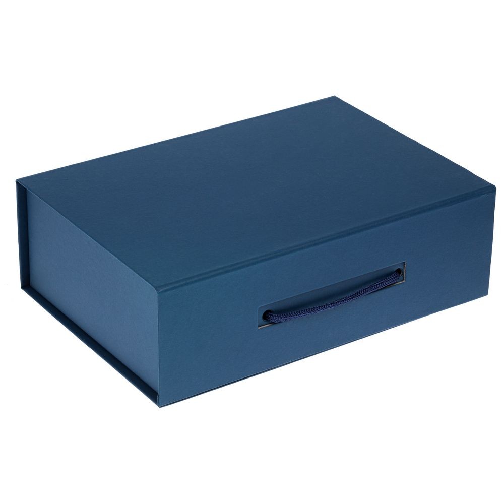 Коробка выполнена из переплетного картона, кашированного дизайнерской бумагой Malmero «Благородный синий», с крышкой на магните.