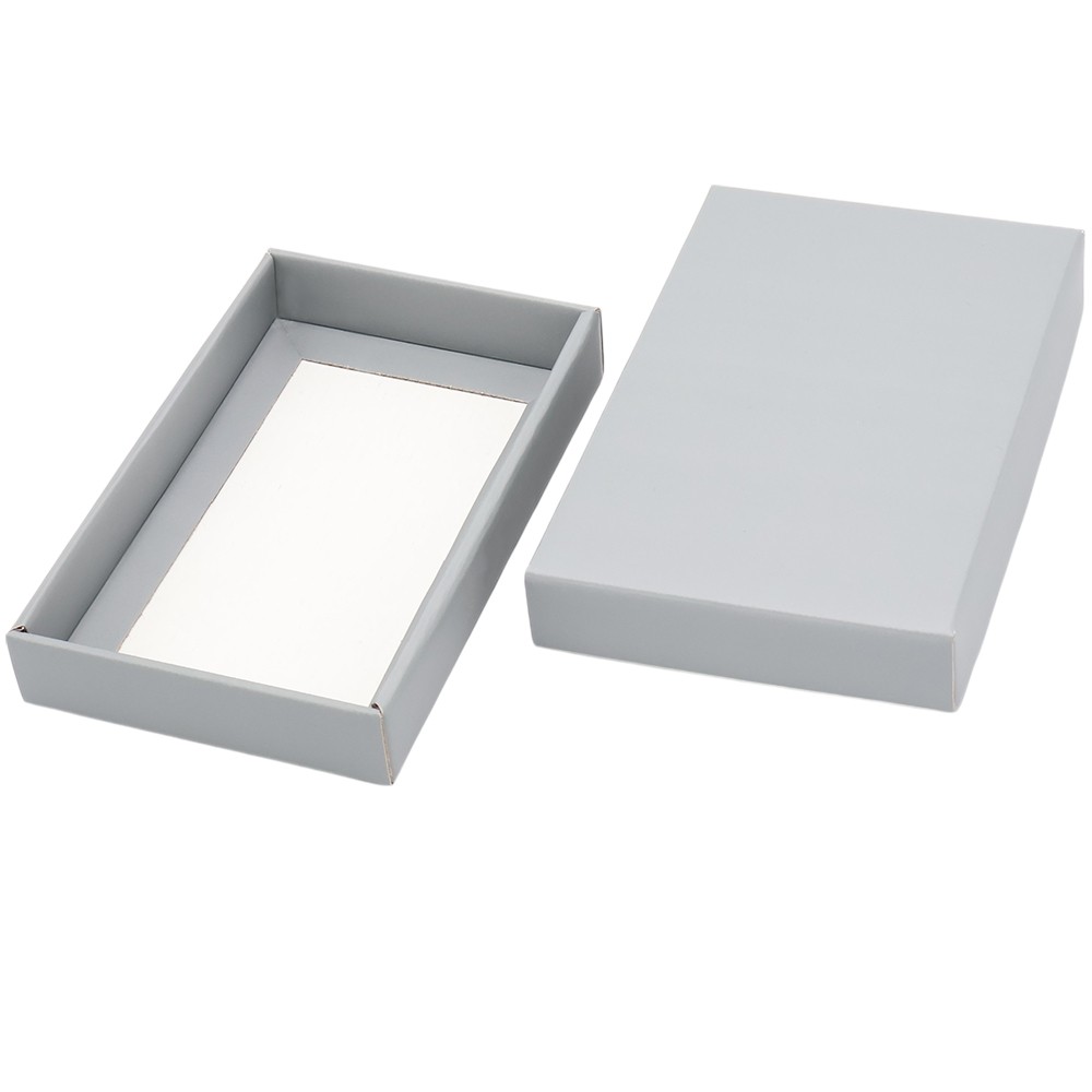 Стильная и функциональная коробка Protect типа "Крышка+дно" в классическом сером цвете с матовой поверхностью. Внутренние размеры коробки: 164*100*24 мм. Основа коробки - гофрокартон Т23Е. Поставляется в разобранном виде!