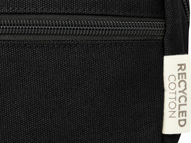 Косметичка из переработанного холста, сертифицированного по стандарту GRS, с подкладкой из переработанного РЕТ-пластика. Имеет передний карман на молнии и одно главное отделение на молнии с карманами для организации, а также удобную лямку. Декоративная металлическая пластина может придать логотипу сияние благодаря утонченному матовому покрытию. Емкость: 3,5 литр.