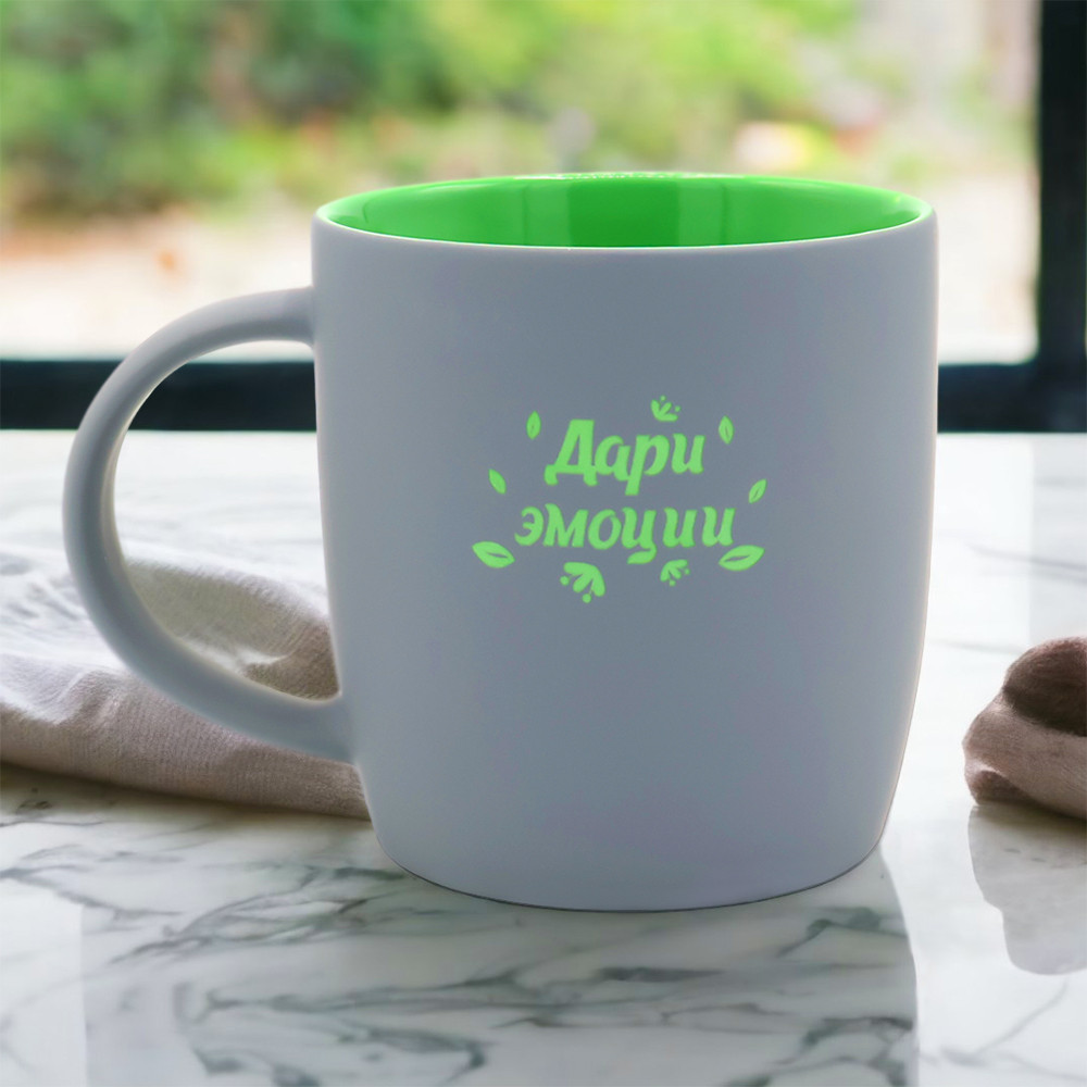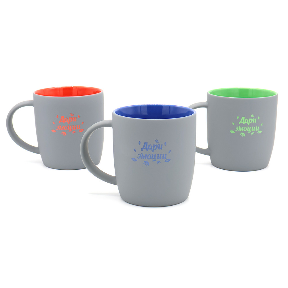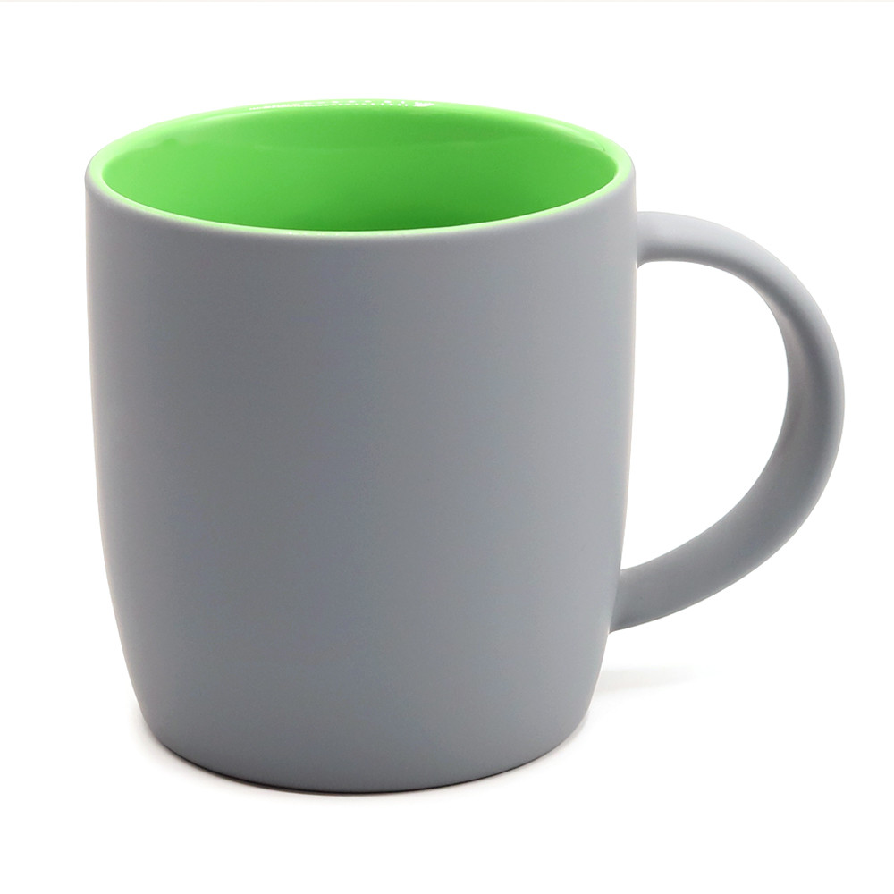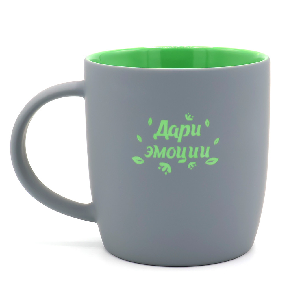 Керамическая кружка Spring объёмом 350 мл с покрытием софт-тач и яркой цветной внутренней частью будет смотреться креативно и выразительно всегда и везде! Необычняа форма кружки, шелковистая прорезиненная поверхность, удобная ручка и яркое покрытие внутри - это всё кружка Spring! В кружке Spring под покрытием софт-тач слоя нанесен слой глазури такого же цвета, что и внутри; и при гравировке вы получаете яркое цветное изображение. Цвета, близкие к пантонам - pantone Cool Gray 10 C, pantone 7739С