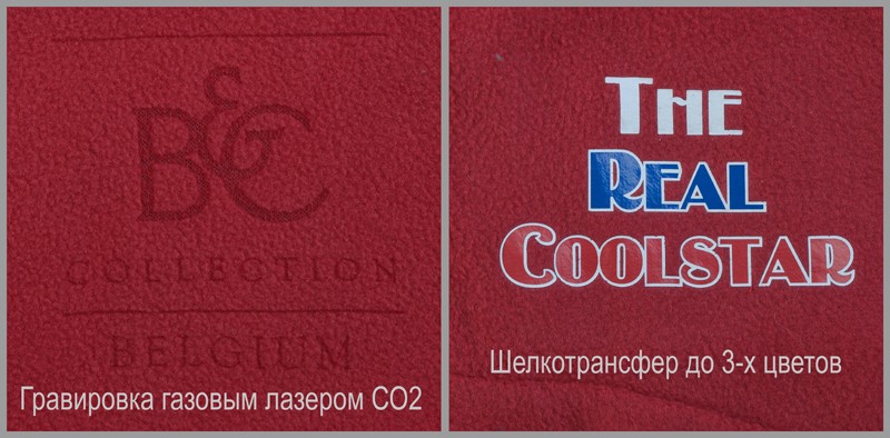 Возможно нанесение методом лазерной гравировки (газовый лазер СО2, код нанесения L1): детальная проработка мелких элементов и тонких линий с высоким контрастом изображения (рекомендуется на флисах темно-красного и стального серого цветов).