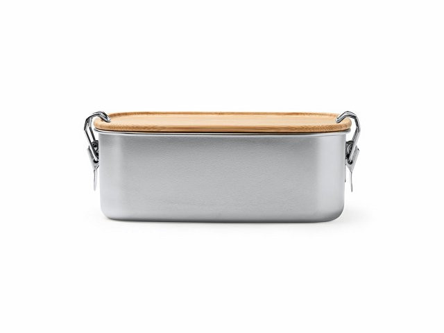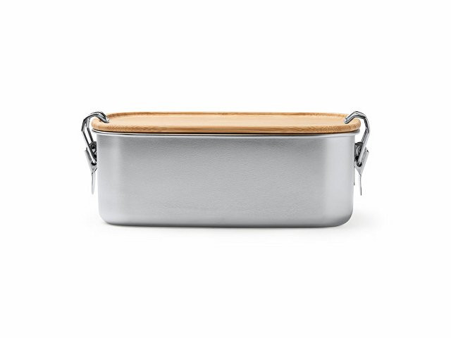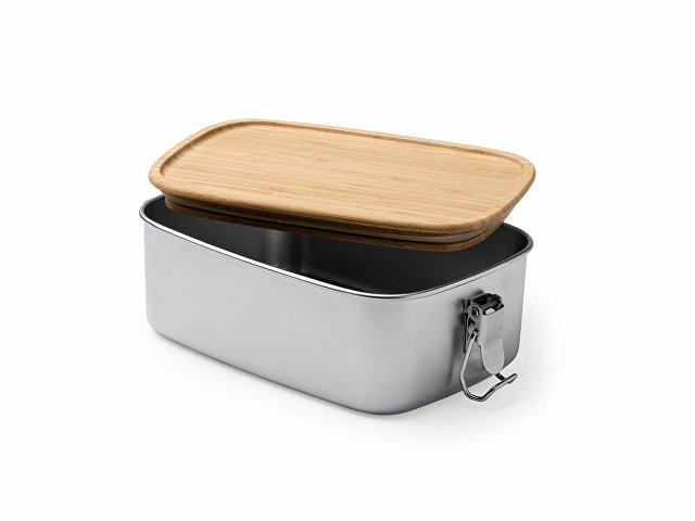 Ланч-бокс из нержавеющей стали 304 с бамбуковой крышкой с системой закрытия с помощью боковых пряжек. Большая емкость 1 л для хранения продуктов.