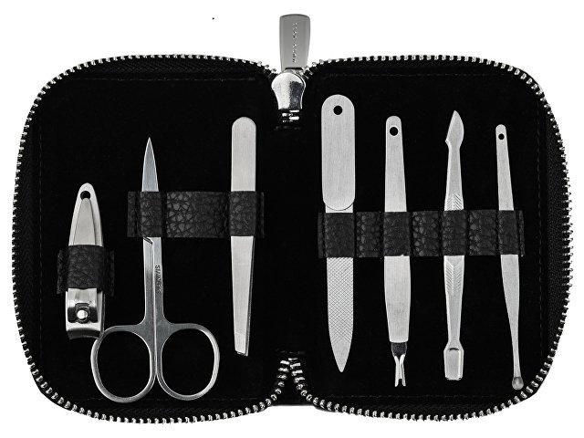 Футляр набора для маникюра "Storyline" выполнен из мягкой эко кожи с зернистой текстурой и украшен красивым хромированным логотипом HUGO BOSS. Футляр застегивается на молнию с логотипом HUGO BOSS. Благодаря компактному размеру набор удобно брать с собой в поездки и путешествия. В набор входит всё самое необходимое: пилочка для ногтей, ножницы, пинцет, ножницы для стрижки ногтей, палочка для чистки ушей, лопатка и триммер для удаления кутикулы.