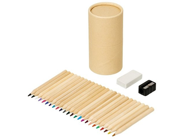 Набор из 24 цветных карандашей, ластика и точилки в круглом картонном футляре, который удобно использовать как карандашницу.