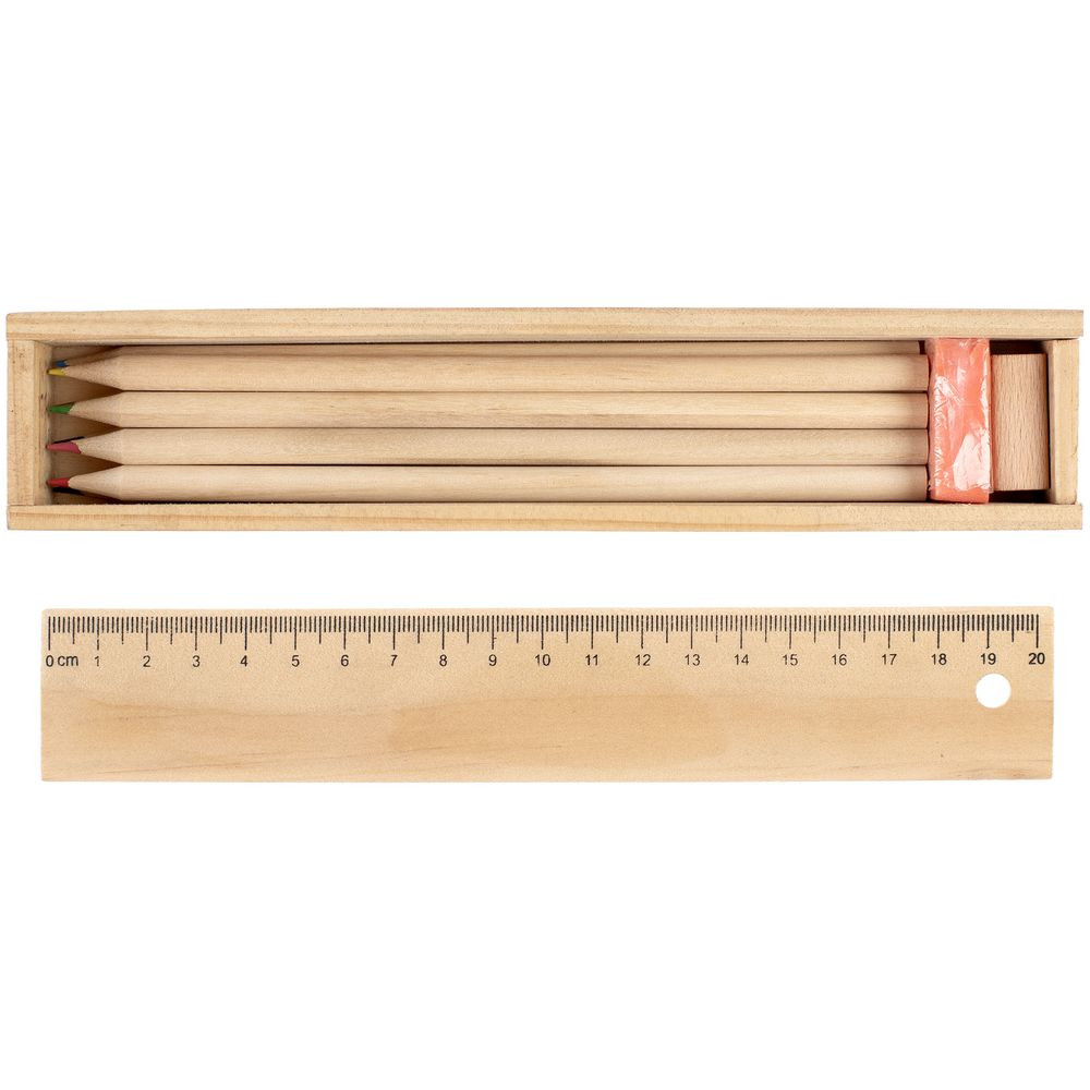 Набор из восьми цветных карандашей, точилки и ластика в деревянном пенале с крышкой-линейкой.
