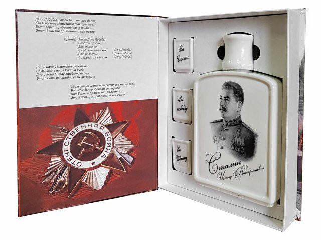 День Победы - один из самых важных и памятных государственных праздников в нашей стране. В этот знаковый для России день принято дарить памятные сувениры. Подарочный набор "День Победы" - это великолепный подарок на 9 мая, который запомнится надолго. Подарочный набор стилизован под книгу и состоит из штофа с изображением генералиссимуса И. В. Сталина и трех рюмок с патриотическими тостами “За Россию”, “За Родину”, “За победу”. Все сувениры выполнены из высококачественной керамики, поэтому они еще долго будут служить и радовать глаз. Этот подарочный набор станет прекрасным дополнением к праздничному столу. Внимание! Данное изделие относится к категории повышенной хрупкости. Для обеспечения его целостности и безопасной транспортировки настоятельно рекомендуется использование обрешетки. Обрешеточная упаковка является обязательной при доставке, и компания Oasis не несёт ответственности за повреждения, возникшие в результате ненадлежащей упаковки или транспортировки без обрешетки.