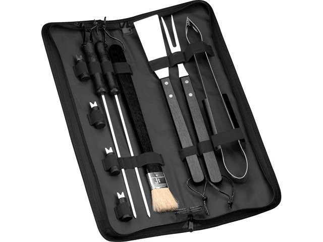 Расчет нанесенияНабор для барбекю "Barabicu" из 10 предметов. Чехол с застежкой на молнии, передним открытым карманом и двумя ручками, включая лопатку, вилку, щипцы, 2 шампура, кухонную кисть и 4 держателя для кукурузы.