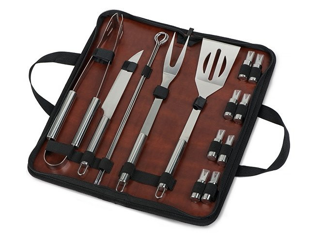 Набор для барбекю Fabrizio состоит из ножа, лопатки, вилки, щипцов, четырех шампуров и восьми вилок для кукурузы, упакованный в чехол-книжку с ручками для переноски. Металлическая часть всех приспособлений для барбекю выполнена из нержавеющей стали. Ручки ножа, вилки и лопатки имеют петельку для подвешивания. Чехол выполнен из искусственной кожи, как и все товары Fabrizio, благодаря чему с набором можно составлять сеты, компонуя с другими изделиями серии. Фиксирующие резинки предусмотрены под каждый компонент набора, что позволит сохранить приспособления для барбекю в полном комплекте и в надлежащем состоянии. В набор входит: - чехол 39,8 х 5,5 х 16 см - BBQ нож 29,5 см - BBQ лопатка 34,5 см - BBQ вилка 34,5 см - BBQ щипцы 34,5 см - шампур 2,5 х 35 см (4 шт) - вилка для кукурузы 1,5 х 6,2 см (8 шт)