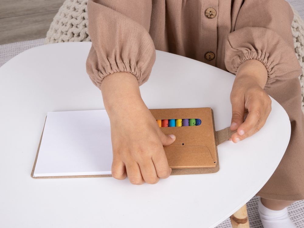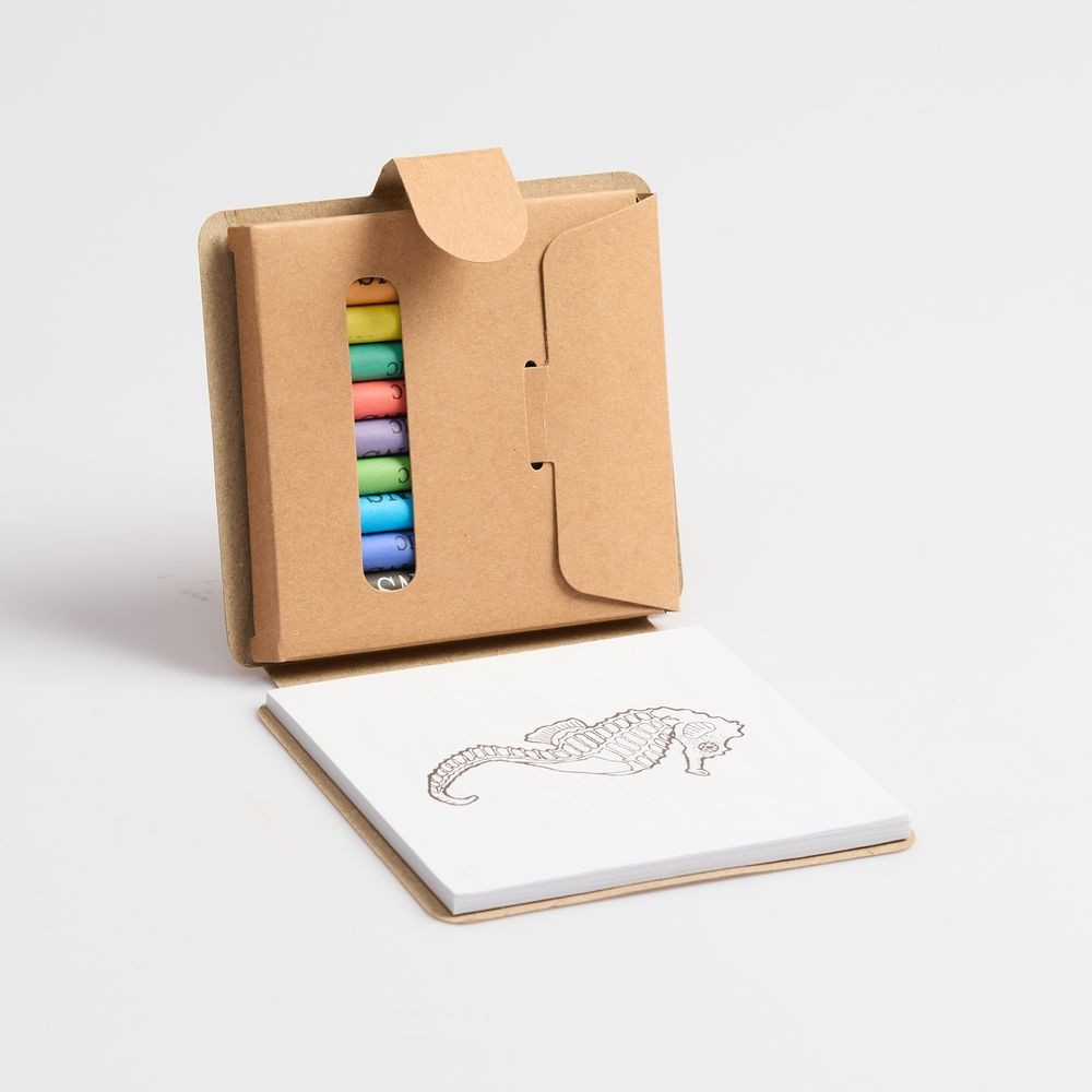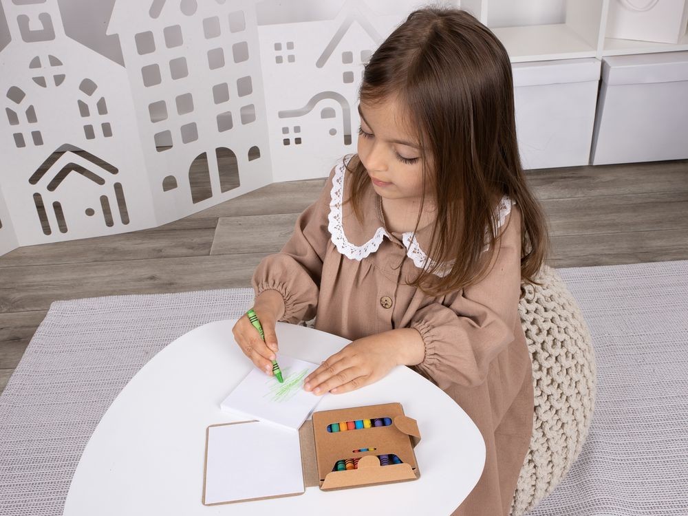 В комплекте 11 цветных восковых мелков и блокнот на 40 страниц для раскрашивания и рисования: 12 страниц с рисунками и 28 чистых страниц. Блокнот и мелки компактно хранятся под одной обложкой.Поставляется в индивидуальном полиэтиленовом пакете с липким краем.