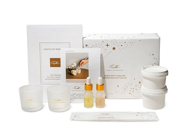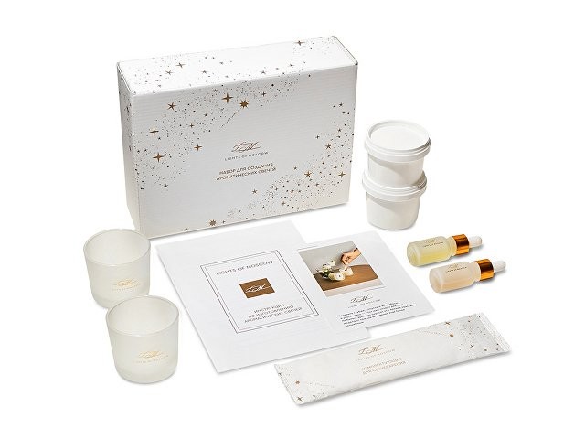 Уникальный набор для изготовления ароматических свечей станет приятным подарком и погрузит в увлекательный процесс. Набор выполнен в подарочной коробке с ложементом, в него входят все необходимые компоненты и подробная инструкция. Откройте для себя удивительный мир ароматов с Lights of Moscow! Вы сможете создать две невероятные композиции, которые точно понравятся Вам и Вашим близким! Условия хранения: — Свечи: +18…+24 °C, вдали от источников тепла, сквозняков и прямых солнечных лучей. — Рекомендуемая влажность — не более 50%. — Избегайте длительного воздействия яркого света. В комплекте: Подарочная брендированная коробка с ложементом - 1 шт. Стакан стеклянный матовый с тиснением логотипа LM 100 мл - 2 шт. Контейнер с соевым воском – 2 шт. Флакон стеклянный матовый c тиснением логотипа LM с ароматической отдушкой – 2 шт. Деревянный фитиль с держателем – 1 шт. Хлопковый фитиль с держателем - 1 шт. Наклейка для крепления фитиля - 2 шт. Палочка для перемешивания - 2 шт. Салфетка - 1 шт. Перчатка - 1 шт. Открытка - 1 шт. Инструкция по изготовлению ароматических свечей – 1 шт.