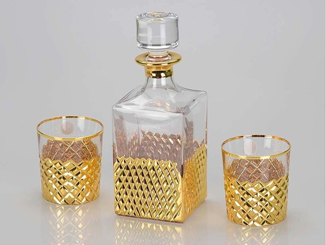 Расчет нанесенияСтильный набор для виски из прозрачного хрусталя рассчитан на две персоны. Набор включает в себя графин, пару бокалов и футляр для хранения. Хрустальная поверхность графина и бокалов задекорирована интересным золотистым узором.