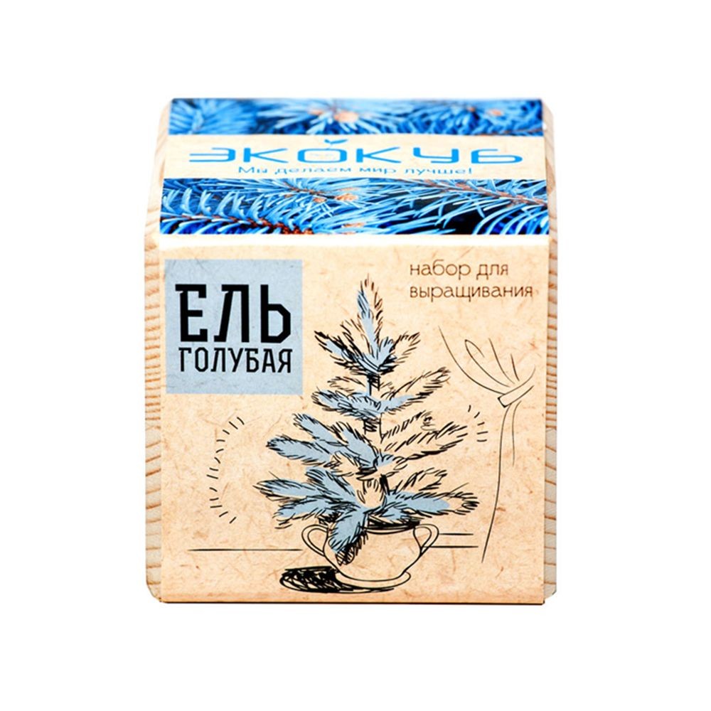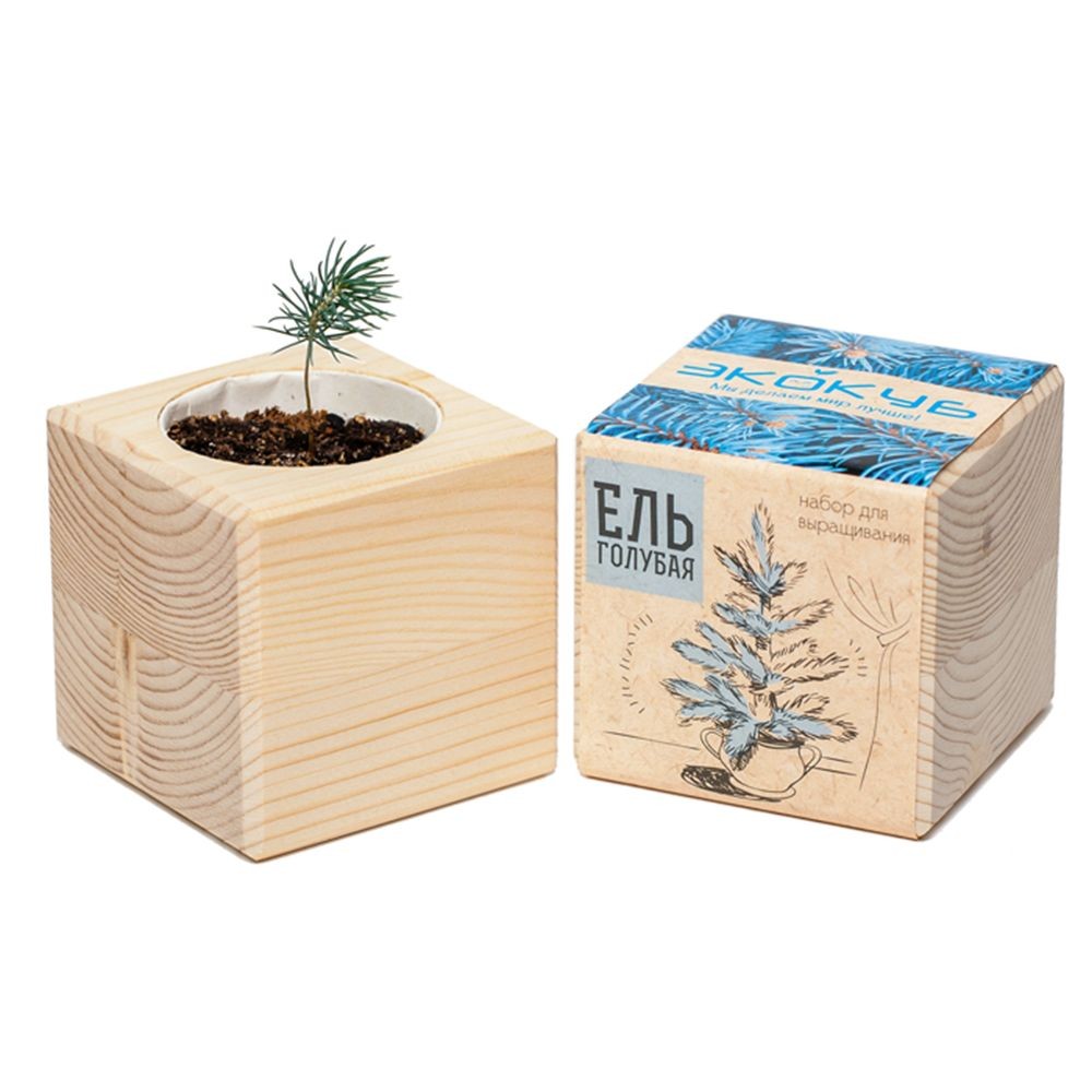 В наборе: деревянный куб, грунт, семена голубой ели.