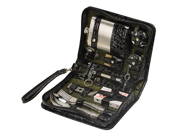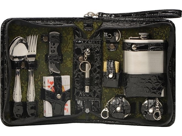 Оригинальный дорожный набор на 2 персоны в барсетке с удобным ремешком для переноски. В набор входит: - фляжка 240 мл- 1 шт - стакан складной 40 мл- 2 шт - ложка столовая- 2 шт - вилка столовая- 2 шт - воронка- 1 шт - нож- 1шт - зажигалка- 1шт - фонарик- 1 шт (батарейка AAA в комплекте) - карты игральные- 1 шт