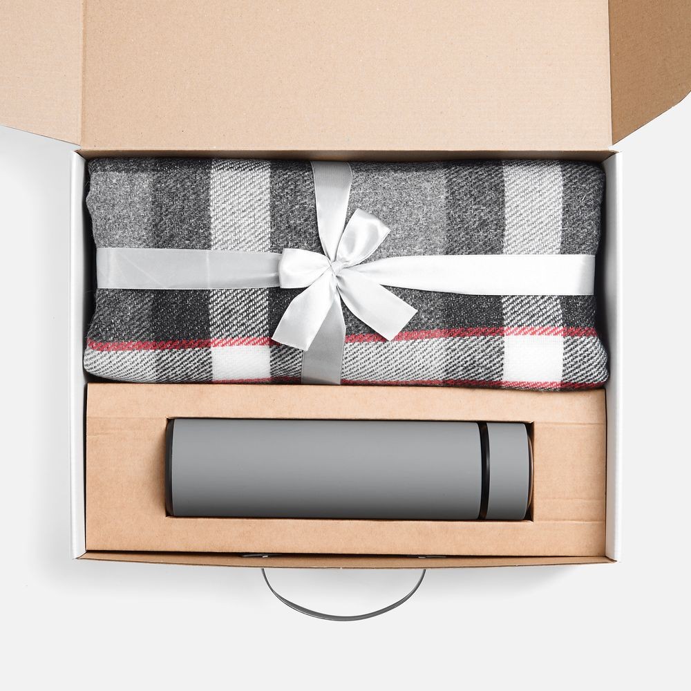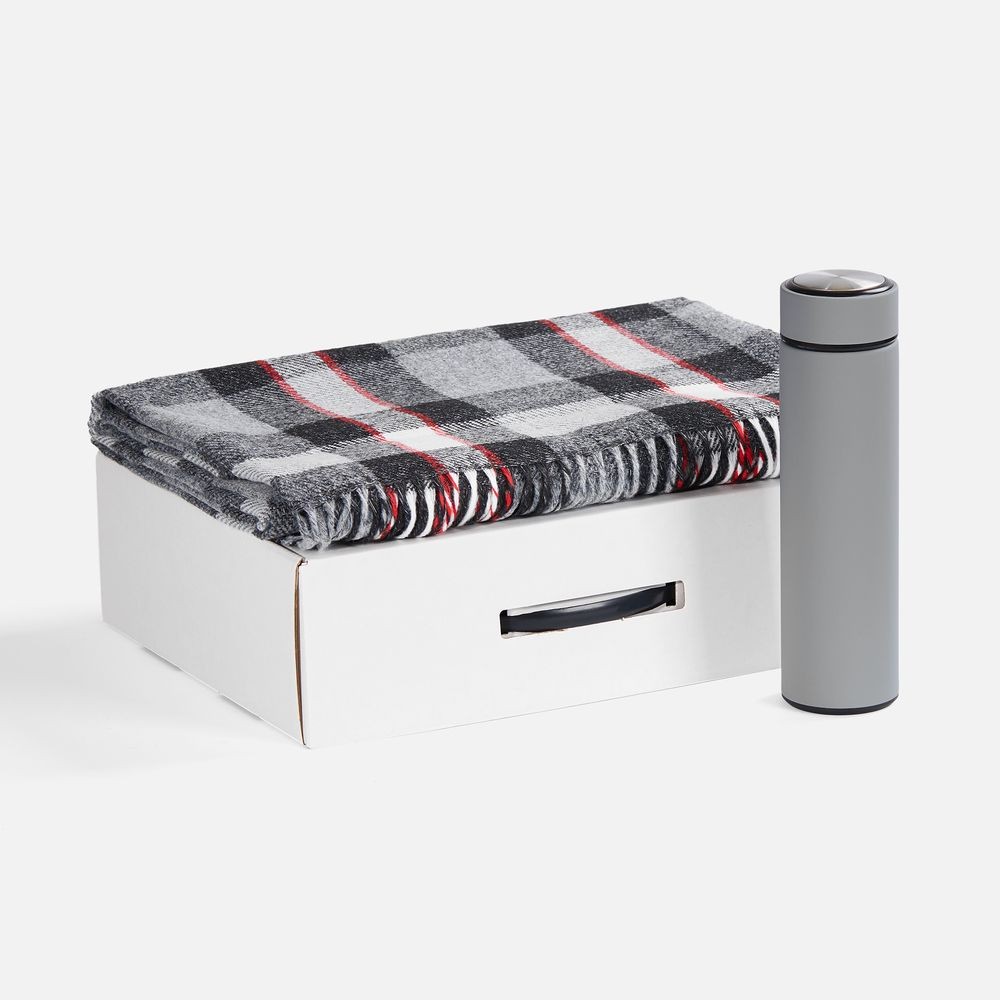 Материал: плед - шерсть, 15%; хлопок, 5%; полиэстер 60%; акрил, 20%, плотность 200 г/м²; термос - нержавеющая сталь, 304; покрытие софт-тач; коробка - картон