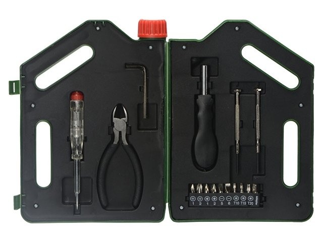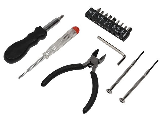 Расчет нанесенияНабор инструментов в футляре в виде канистры включает в себя 1 тестер напряжения, 1 пару плоскогубцев, 1 шестигранный ключ, 1 рукоятку, к которой можно крепить отвертки, 2 прецизионные отвертки, 1 крестообразную головку, 1 плоскую головку, 10 бит.