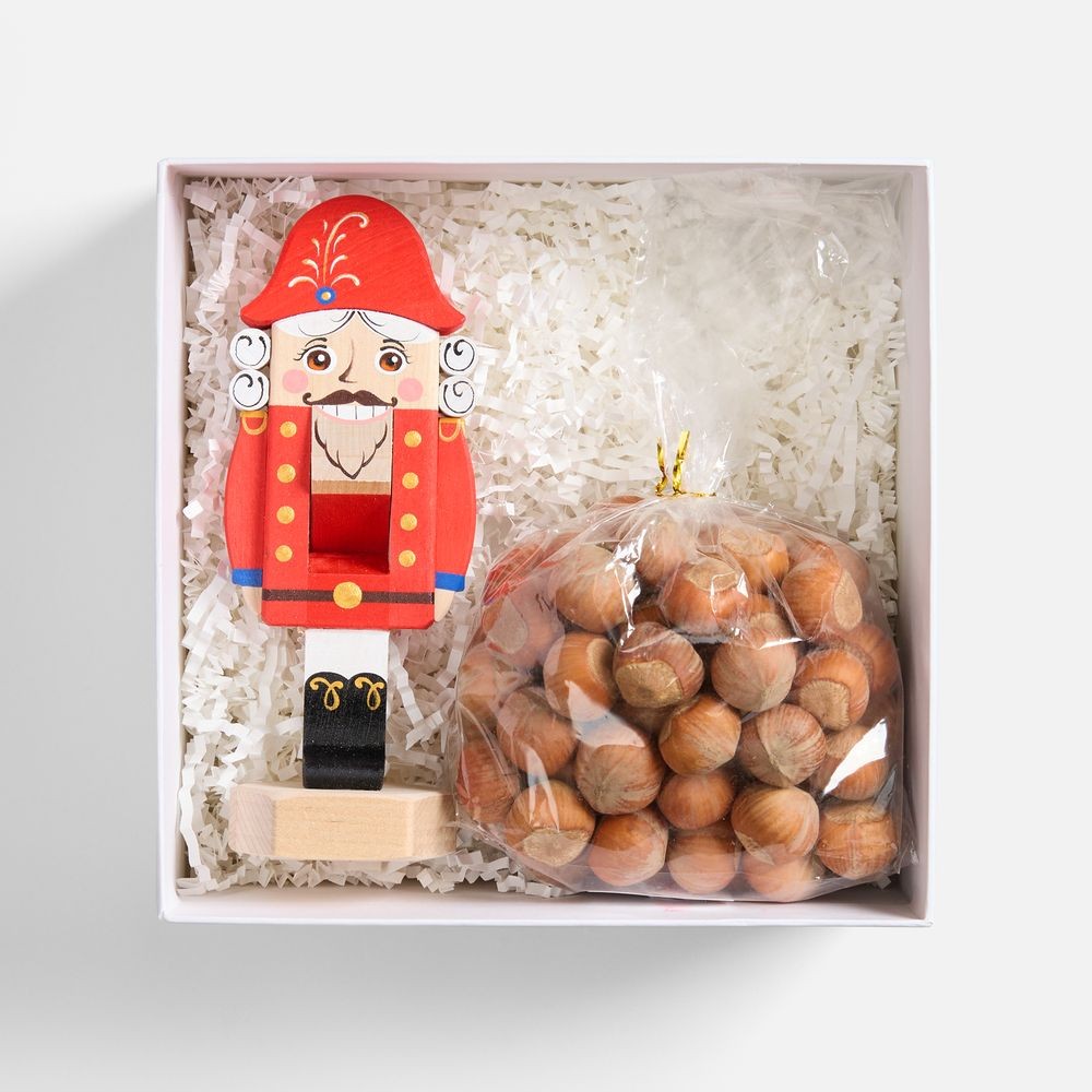 В комплекте: подарочная коробка, наполнитель, орехокол и орехи.
