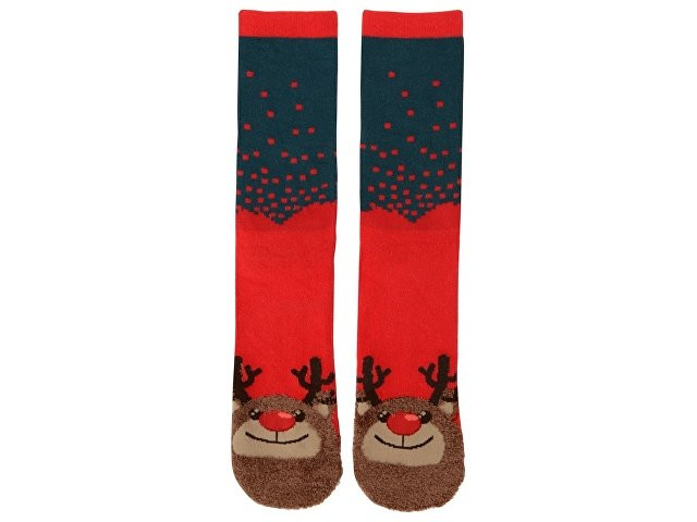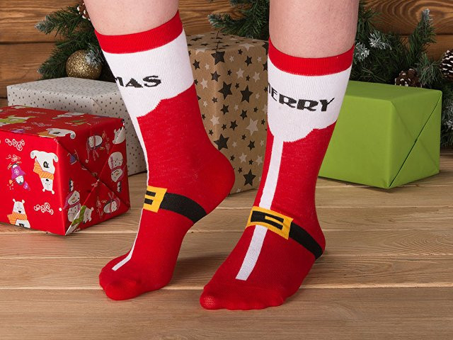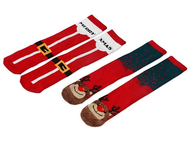 Рождественские носки прекрасно подойдут на роль подарка, который создает праздничное настроение. Этот набор состоит из двух пар, которые упакованы в мешочек из натурального хлопка. Одна пара украшена мягкими пушистыми мордочками рождественских оленей, а принт на второй изображает сапожки Санта Клауса. Ткань -- смесь хлопка, полиэстера и спандекса, что обеспечивает носкам износостойкость, а мягкая широкая резинка – удобную посадку по ноге. Мешочек-упаковку можно брендировать по вашему желанию. Размер носков 36-39.