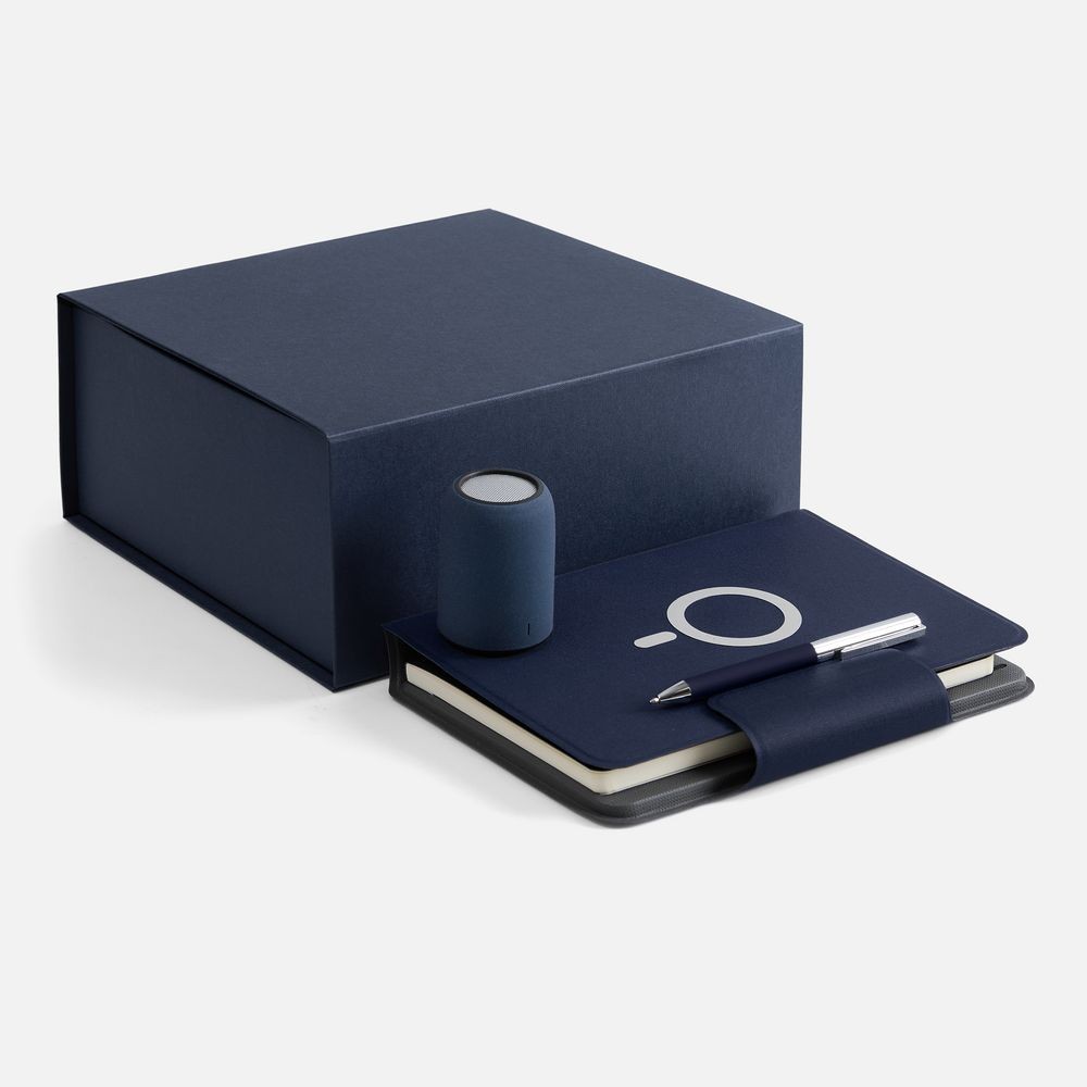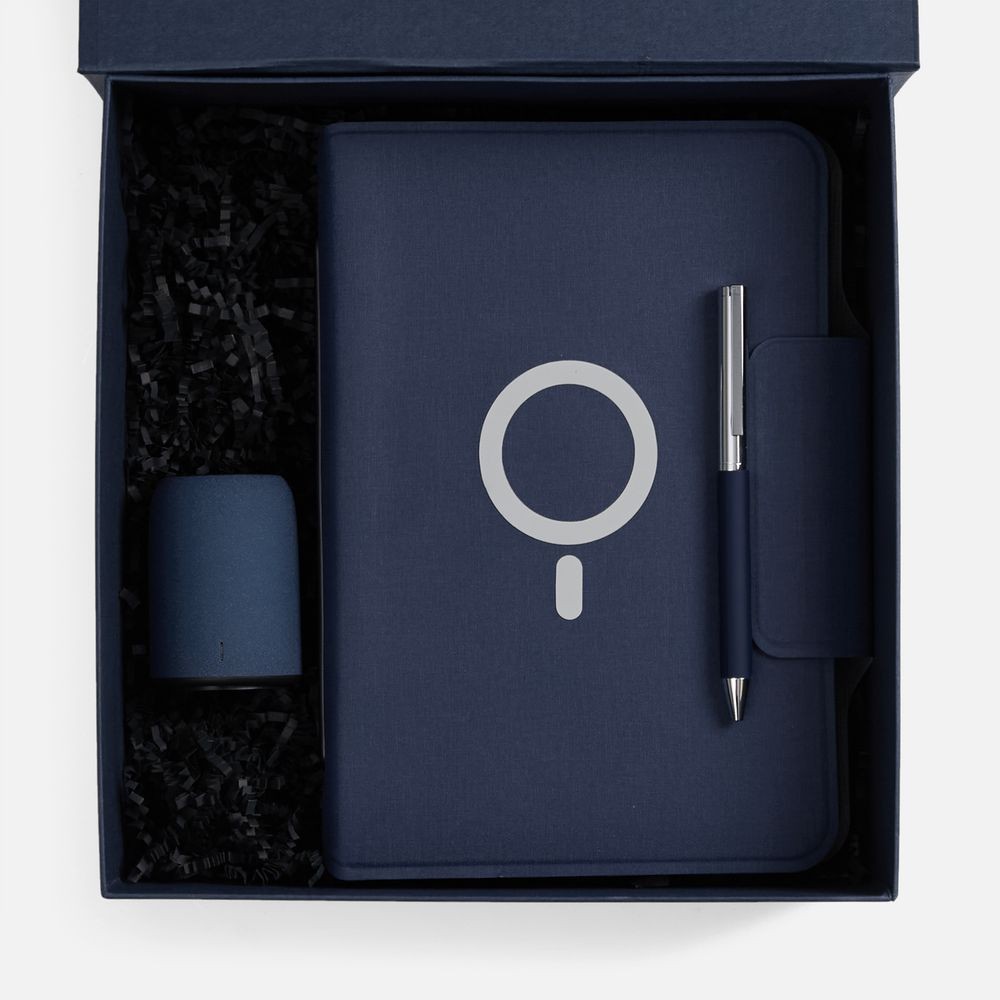 За музыкальную паузу отвечает компактная беспроводная колонка Uniscend Grinder, которая дает неожиданно яркий и достоверный звук. Отделка, имитирующая мягкую ткань, дарит приятные тактильные ощущения — приятный бонус для меломана.Особое удовольствие при письме дарит и софт-тач корпус приятно тяжелой металлической ручки Eyeshot Soft Touch в темно-синем цвете — современное прочтение классики. Центральное место в наборе, конечно, занимает органайзер Oiro с блокнотом, подставкой для смартфона и встроенным аккумулятором для беспроводной зарядки — практичное смарт-решение в организации рабочего процесса, где каждая деталь продумана для максимального комфорта и подлинного удовольствия.Oiro. Больше, чем просто подарок.