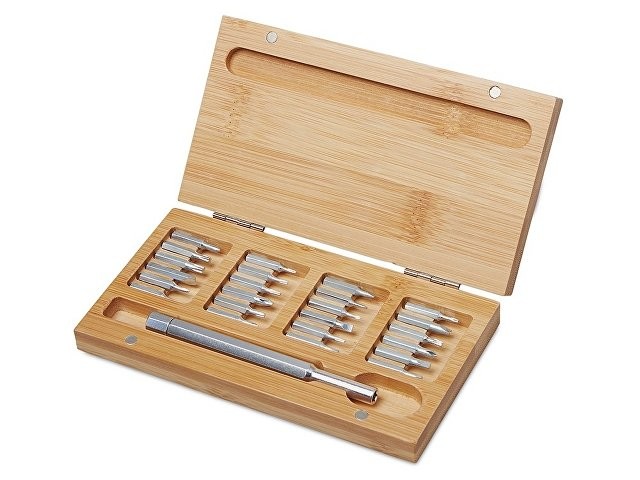 Стильный и практичный набор отверток в элегантном корпусе из натурального бамбука. Компактный кейс закрывается на магниты, а верхняя крышка отмечена круглым красным стикером для удобной идентификации. Внутри — отвертка и 24 наиболее востребованные биты: крестовые, плоские и «звездочки», которые подойдут для решения большинства бытовых и профессиональных задач. Набор выполнен из экологичных материалов — прочной стали и натурального бамбука. Классическая прямоугольная форма без выступающих деталей делает его особенно удобным для персонализации и нанесения логотипа. • 24 популярные биты в одном наборе • Экологичные материалы: натуральный бамбук и сталь • Магнитная фиксация крышки • Удобная прямоугольная форма под нанесение логотипа • Компактный и презентабельный дизайн