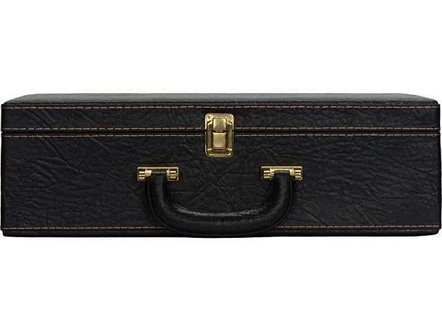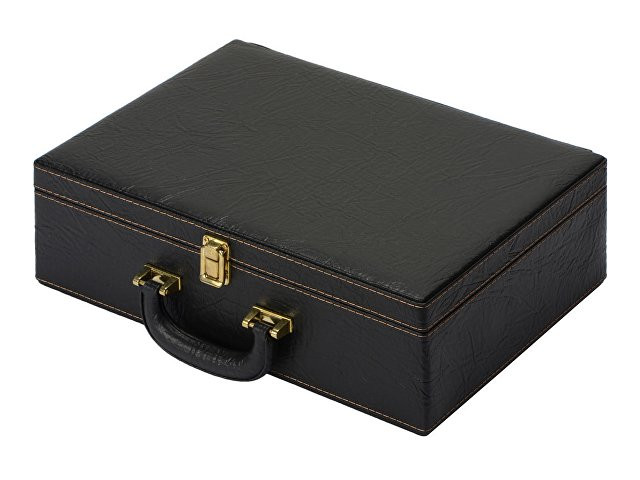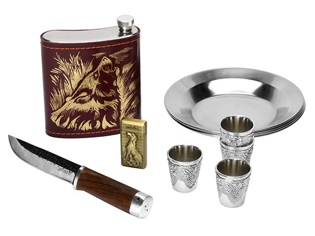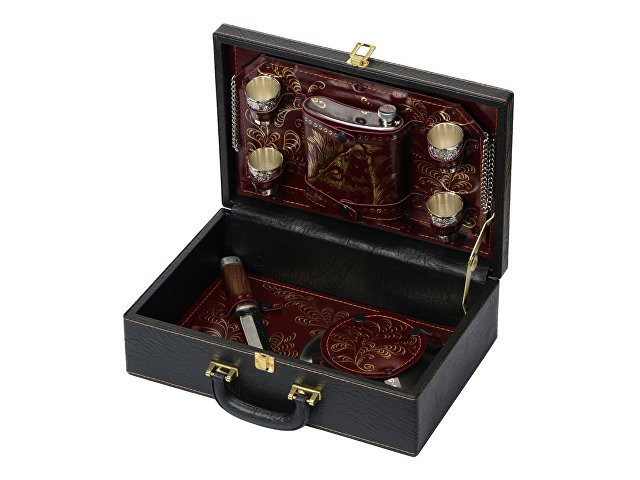 Кейс из сплит-кожи, с повышенной износостойкостью, внутренняя отделка натуральная кожа. В комплекте: Фляга 240 мл (нерж.сталь)– 1шт. Стопка 40 мл (нейзильбер)– 4 шт. Зажигалка зиппо– 1 шт. Нож "Универсал" (нерж. сталь) 45Х13, рукоять орех, бронзовое литье– 1 шт. Тарелка из нейзильбера– 4 шт.