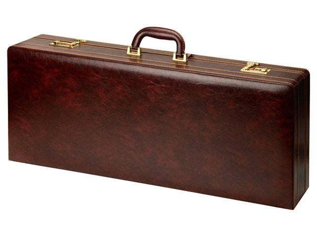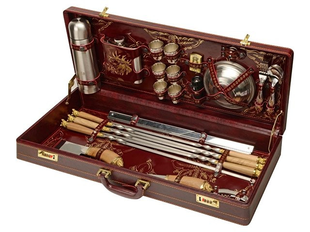 Кейс из сплит-кожи, с повышенной износостойкостью, внутренняя отделка натуральная кожа с художественным выжиганием. В комплект входит: Нож "Тяпка" 27,5 х 7 х 3 см - 1шт Нож 29 х 4,5 х 3 см - 1шт Штопор 11 х 3 х 1 см -1 шт Ножки для мангала 51 х 31 х 1 см - 2шт Шампур d2,5 х 68 см - 6шт Термос d7 х 24,5 см - 1шт Фляга 13 х 15 х 3см - 1шт Стопка d5,2 х 5 см - 6шт Зажигалка 4 х 1,3 х 6 см - 1шт Фонарик d3 х 9,5 см - 1шт Тарелка d16 х 4 см - 6шт Воронка d3,7 х 2,7 см - 1шт Ложка 19,3 х 4,5 х 3 см - 6шт Вилка 19,3 х 2,5 х 2 см - 6шт