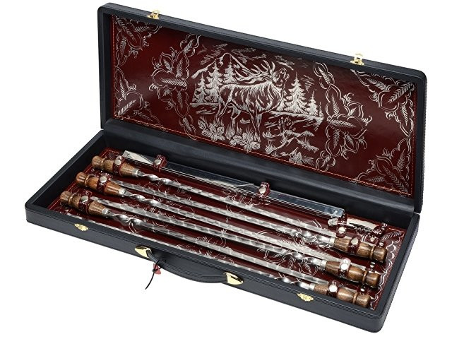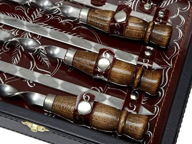 Солидный чемоданчик с набором шампуров и мангал не оставят равнодушными ни одного любителя шашлыка. Немаловажно, что ручка у шампуров деревянная - кроме красоты, это еще и удобно - дерево приятнее брать, оно не нагревается (если, конечно, не совать его в огонь). Кроме того, в подарке имеются нож сомелье, с помощью которого вы сможете с легкостью открыть бутылку. Кейс из сплит-кожи, с повышенной износостойкостью, внутренняя отделка натуральная кожа с художественным выжиганием. В комплекте: мангал- 1 шт шампура- 6 шт нож сомелье- 1 шт