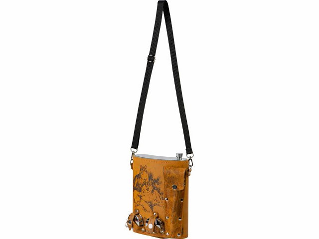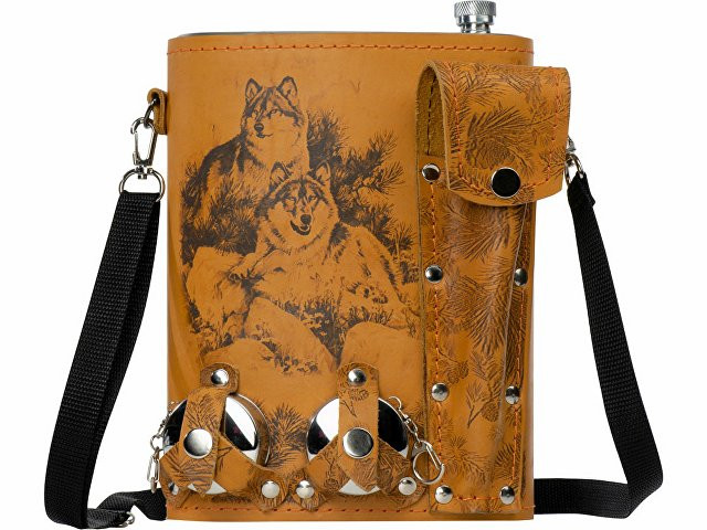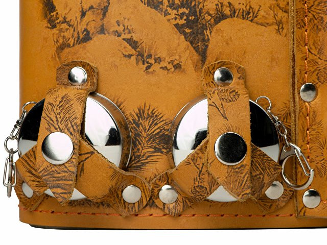 Фляга 2л в оплетке из натуральной кожи с нанесением рисунка методом художественного выжигания. Комплектация: - стаканчик складной – 2 шт - вилка (нерж.сталь) – 2 шт