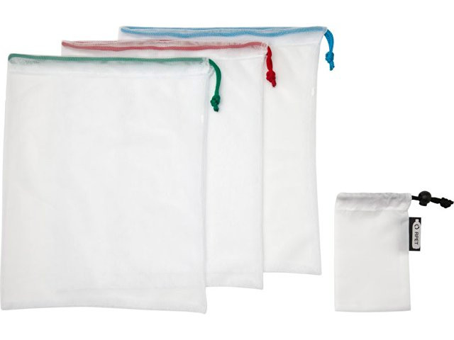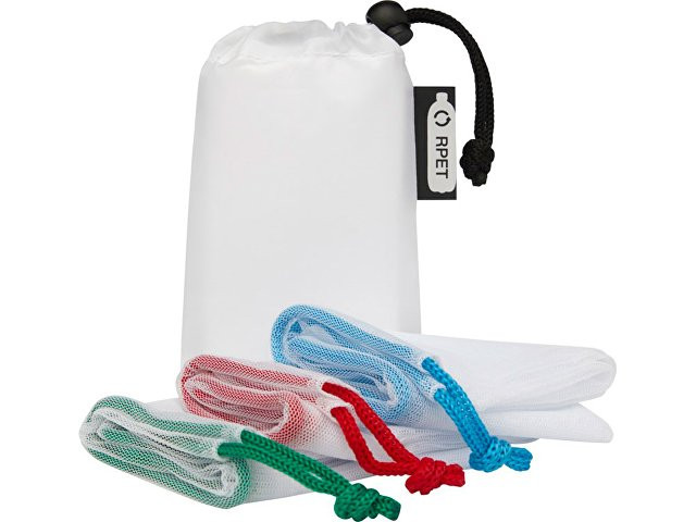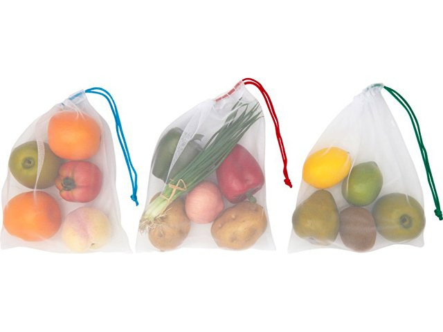 Расчет нанесенияНабор из 3 сетчатых сумок из вторичного ПЭТ. Сумки многоразового использования, их можно использовать для фруктов и овощей как альтернативу пластиковым пакетам. У всех сумок есть затягивающий шнурок. Переработанный PET пластик.