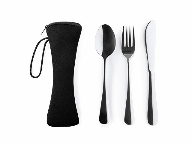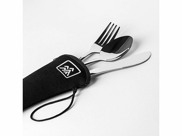 Расчет нанесенияНабор столовых приборов из нержавеющей стали в практичном неопреновом футляре. Включает в себя вилку, нож и ложку, идеально подходящие для того, чтобы брать их с собой куда угодно.