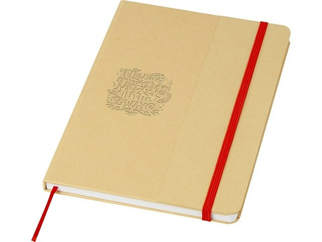 Блокнот формата А5 в твердой обложке из переработанного картона, 80 листов бумаги плотностью 70 г/м² в линейку. Блокнот имеет эластичную застежку, ленту и закругленные углы. FSC certified paper. FSC Mix 100% P7.1 CU-COC-877277.