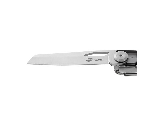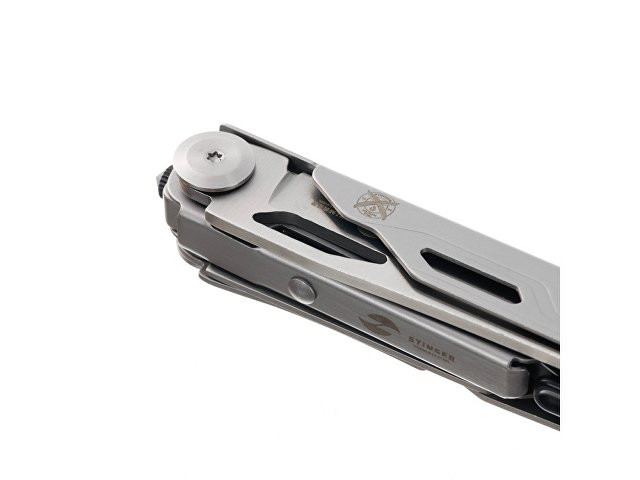 Нож перочинный STINGER имеет 9 функций: 1. Лезвие с фиксатором клинка Liner Lock 2. Ножницы 3. Пила 4. Лезвие с серрейторной заточкой 5. Открывалка для бутылок 6. Консервный нож 7. Инструмент для снятия изоляции 8. Стеклобой 9. Клип ХАРАКТЕРИСТИКИ Материалы • лезвие/инструменты: нержавеющая сталь 440A, твердость 54-58 HRC • рукоять: нержавеющая сталь 440A, твердость 54-58 HRC Размеры • Размеры ножа: 112х20х25 мм • Общая длина: 185,5 мм • Длина клинка: 79,3 мм • Наибольшая ширина клинка: 17 мм • Толщина обуха: 2,5 мм • Длина рукояти: 111,3 мм • Ширина рукояти (в ср.части): 19,4 мм • Толщина рукояти (в ср.части): 18,9 мм Вес: 141 г Цвет: серебристый Упаковка: картонная коробка
