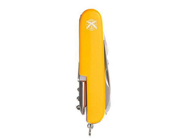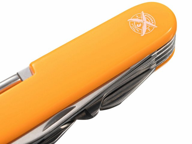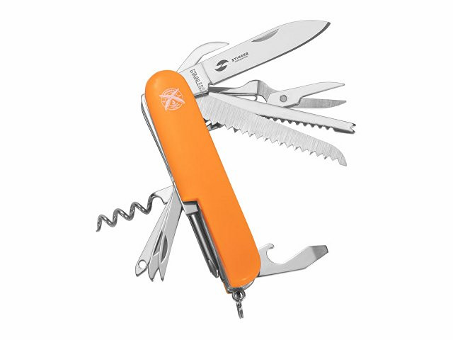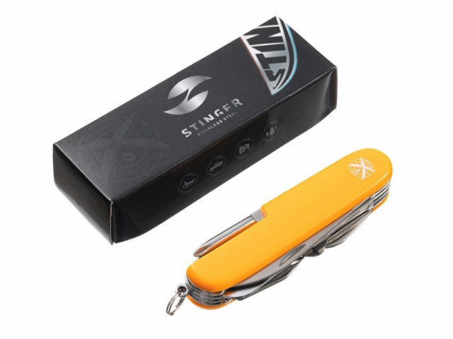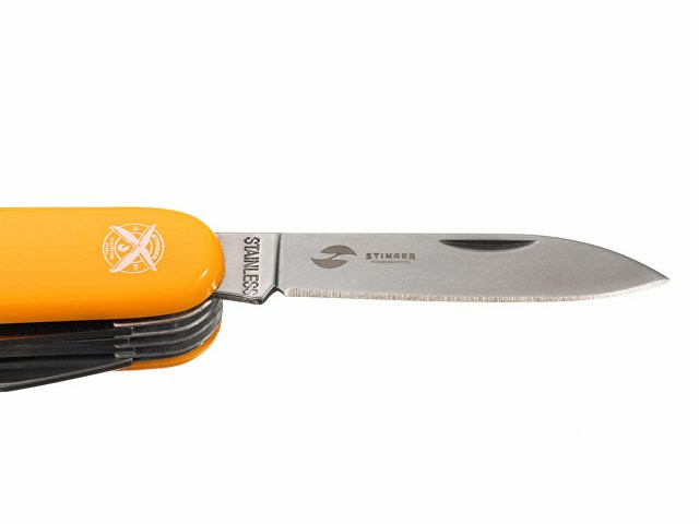 Нож перочинный STINGER имеет 15 функций: 1. Большое лезвие 2. Пила по дереву 3. Инструмент для чистки рыбы с: 4. - Инструментом для извлечения рыболовного крючка 5. Ножницы 6. Консервный нож 7. Открывалка для бутылок с: 8. - Отверткой 9. Крестовая отвертка 10. Ледокол 11. Пилка для ногтей с: 12. - Инструментом по уходу за ногтями 13. Игла 14. Штопор 15. Кольцо для ключей ХАРАКТЕРИСТИКИ Материалы: • лезвие/инструменты: нержавеющая сталь AISI 420, твердость 44-48 HRC • рукоять: нержавеющая сталь AISI 420, твердость 44-48 HRC • накладки рукояти: АБС-пластик Размер: 89 мм Вес: 110 г Цвет накладок рукояти: оранжевый Накладки рукояти ножа не подлежат замене. Упаковка: картонная коробка